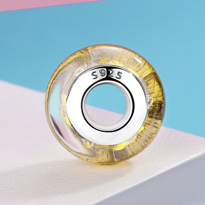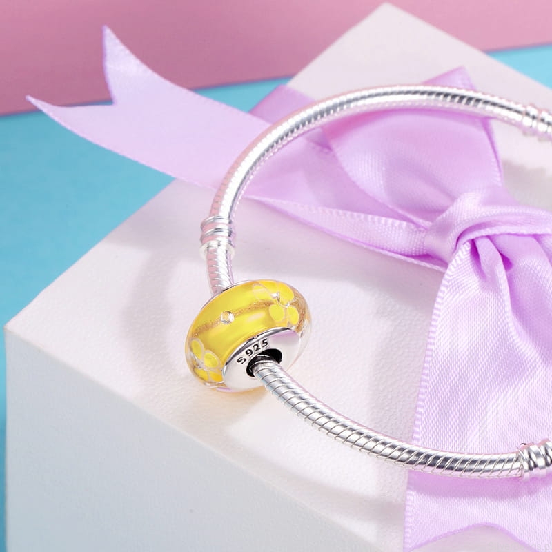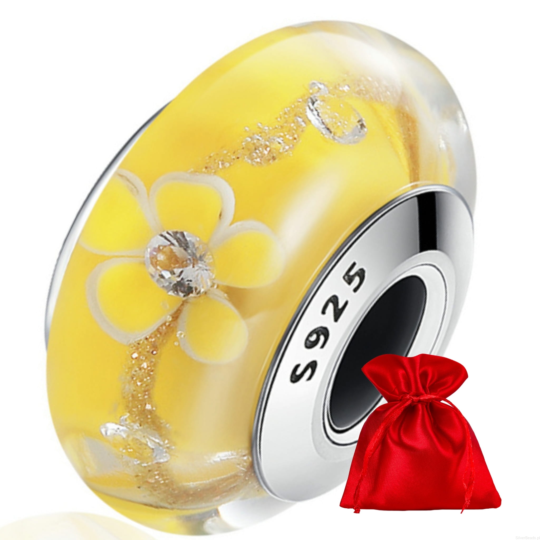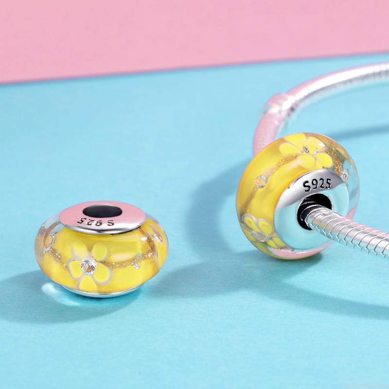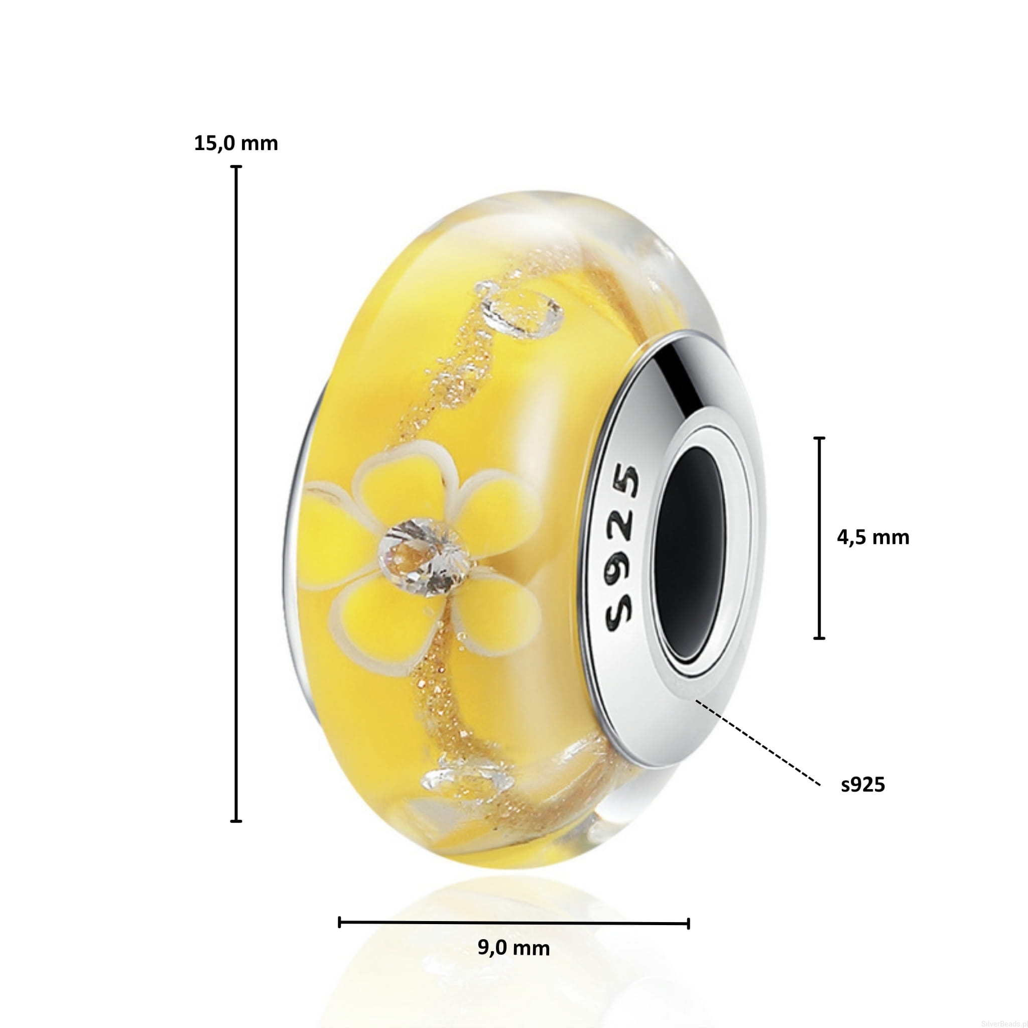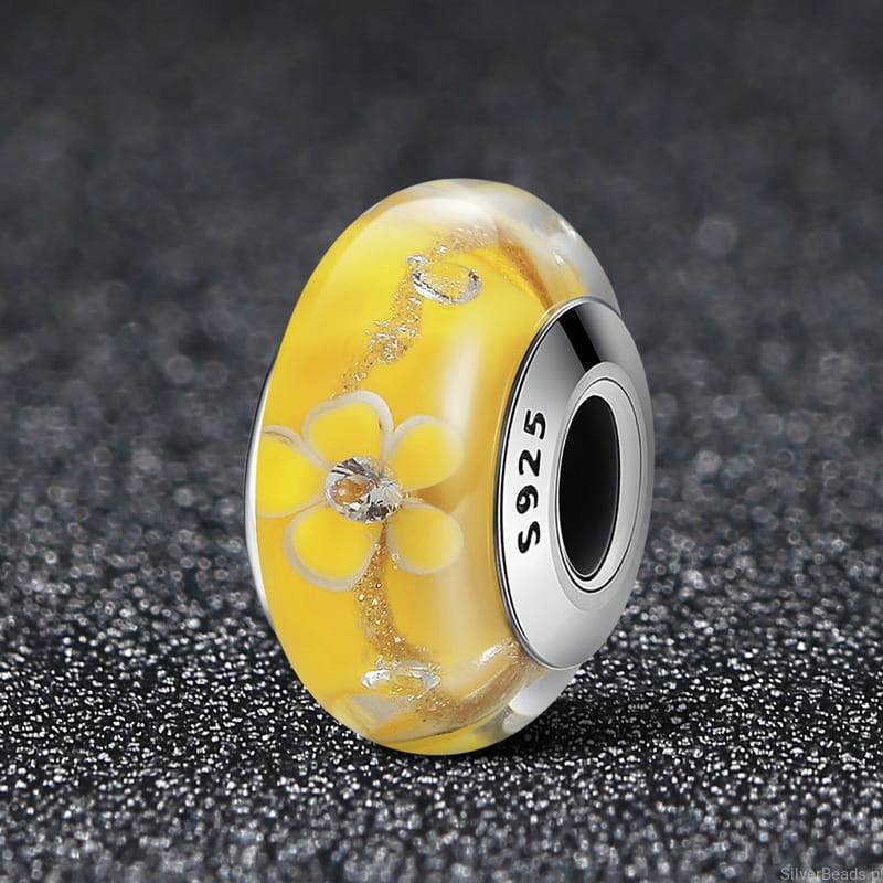 Charms szklany koralik z brokatem i żółtymi kwiatami szkło srebro 925