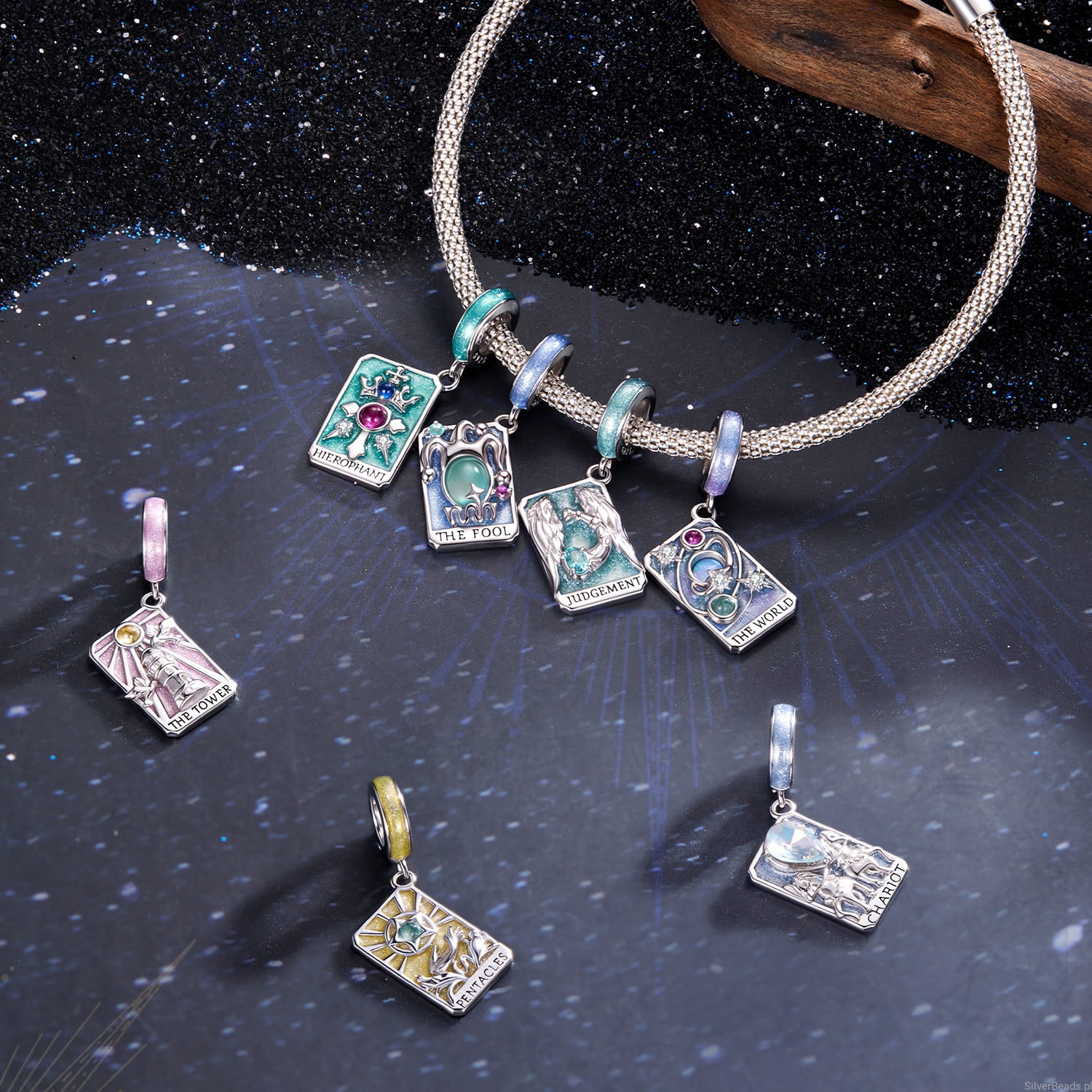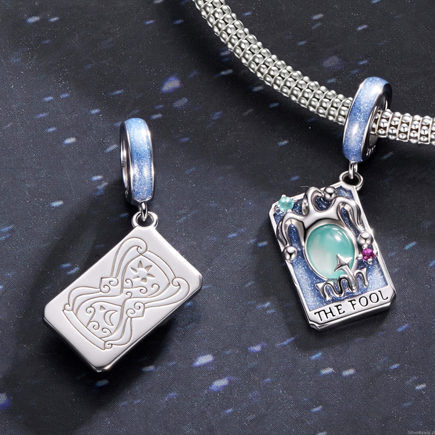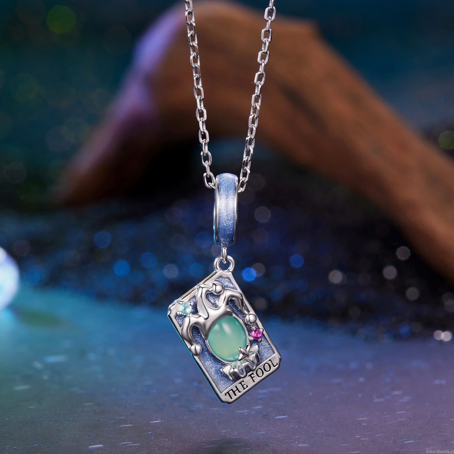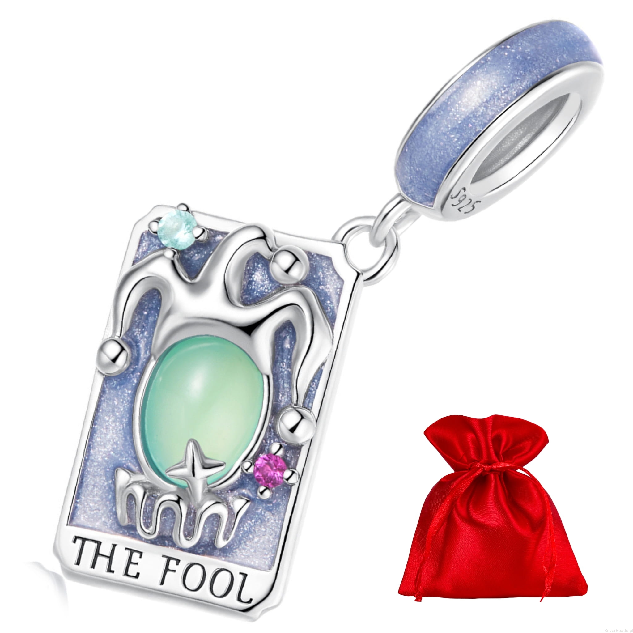 Ten wyjątkowy charms karta tarota głupiec ukazuje postać błazna otoczoną iskrzącymi kamieniami i opalowym oczkiem na tle błękitnej emalii. Symbolizuje odwagę rozpoczęcia od nowa, wolność ducha i zaufanie do nieznanego. Wykonany ze srebra próby 925, przyciąga marzycielki i wolne dusze, które nie boją się podążać za intuicją. Idealny dla tych, którzy w życiu szukają przygody, lekkości i magii pierwszego kroku.