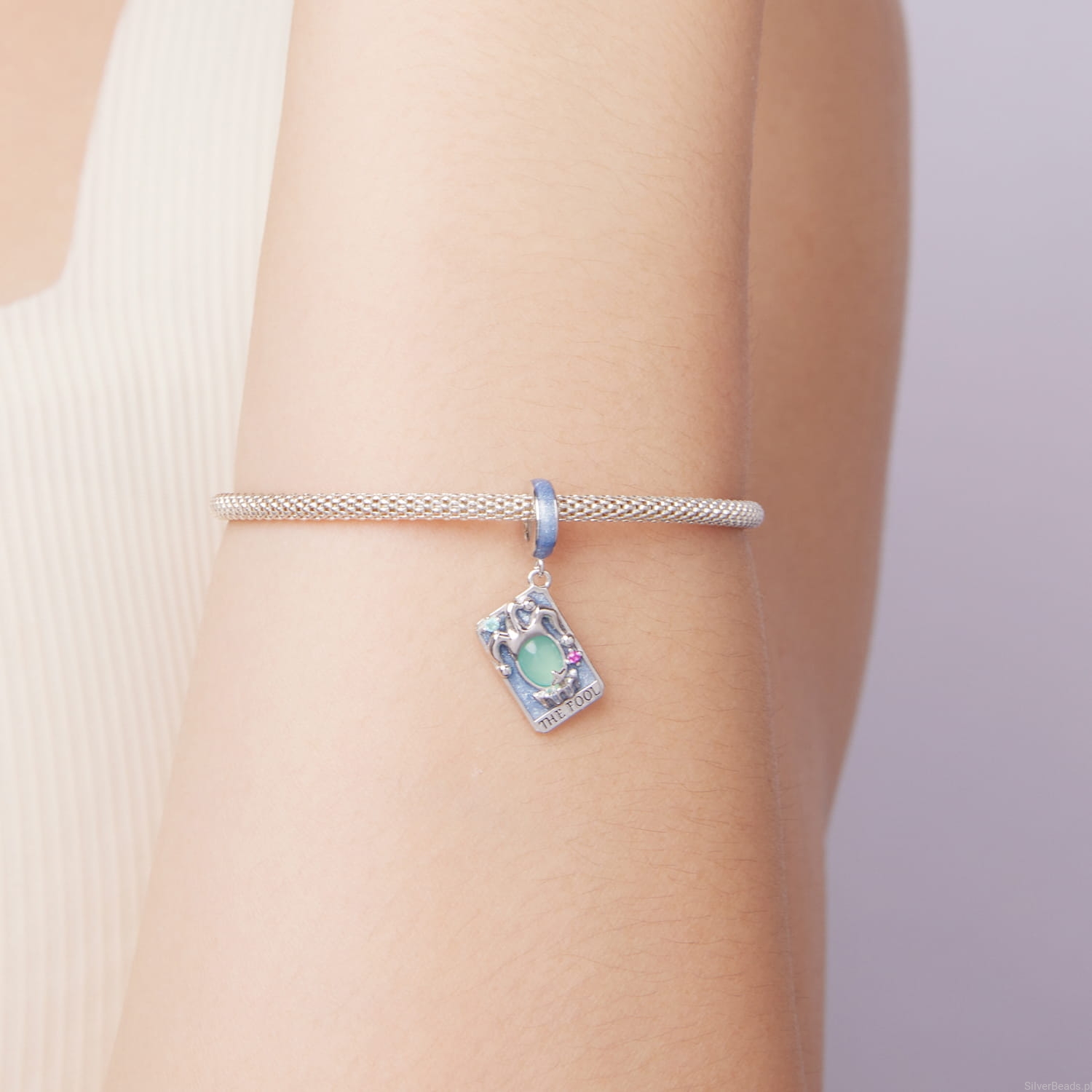 Srebrna zawieszka charms: karta Tarota głupiec.