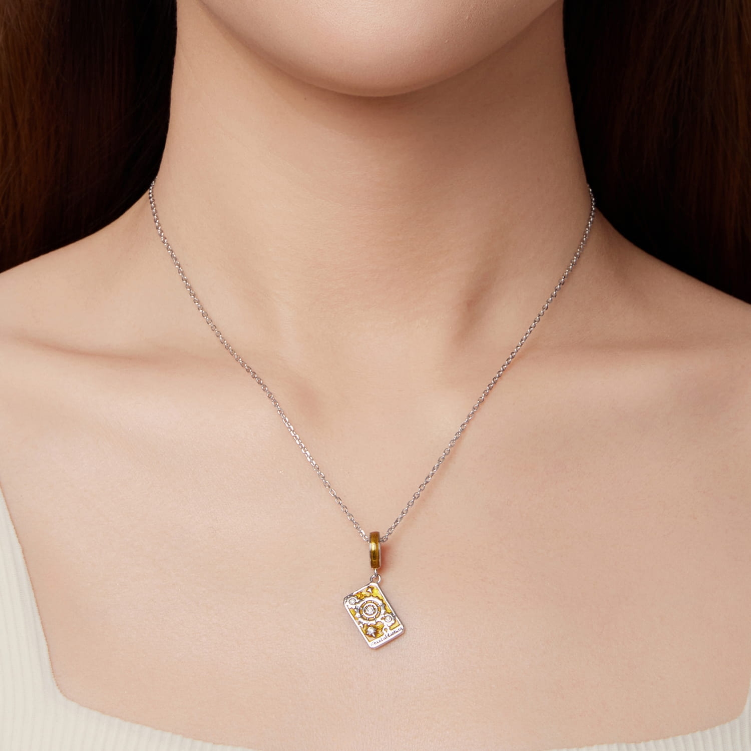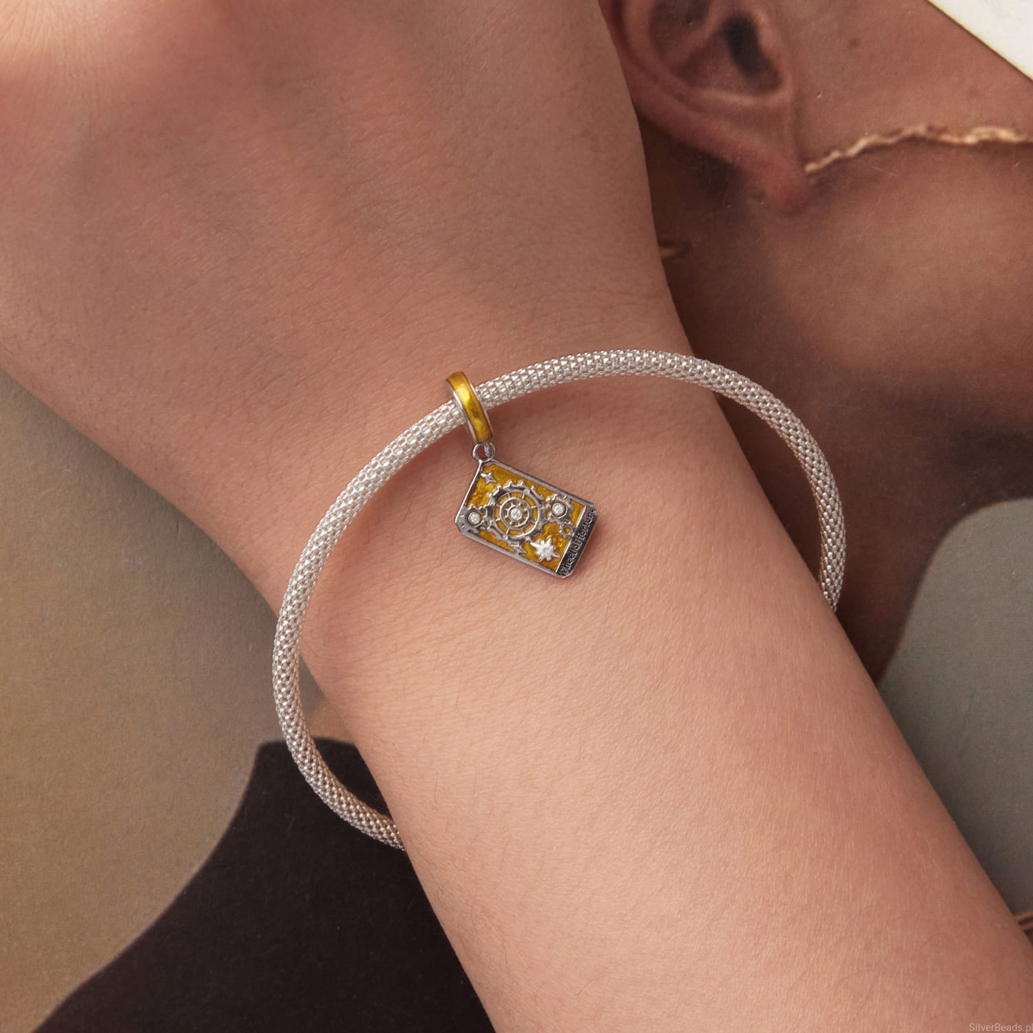 Charms Koło Fortuny to wyjątkowa zawieszka symbolizująca przeznaczenie, zmienność i życiowy cykl. Wykonany ze srebra, ozdobiony złocistą emalią i misterną kompozycją trybów oraz błyszczących kamieni, przyciąga wzrok swoim energetycznym charakterem. Centralny motyw koła symbolizuje ruch, transformację oraz wiarę w to, że los potrafi odmienić się w każdej chwili. To nie tylko piękny dodatek do bransoletki, ale także silny talizman niosący przesłanie nadziei i harmonii. Idealny dla osób kochających magię, duchowość i biżuterię z głęboką symboliką.