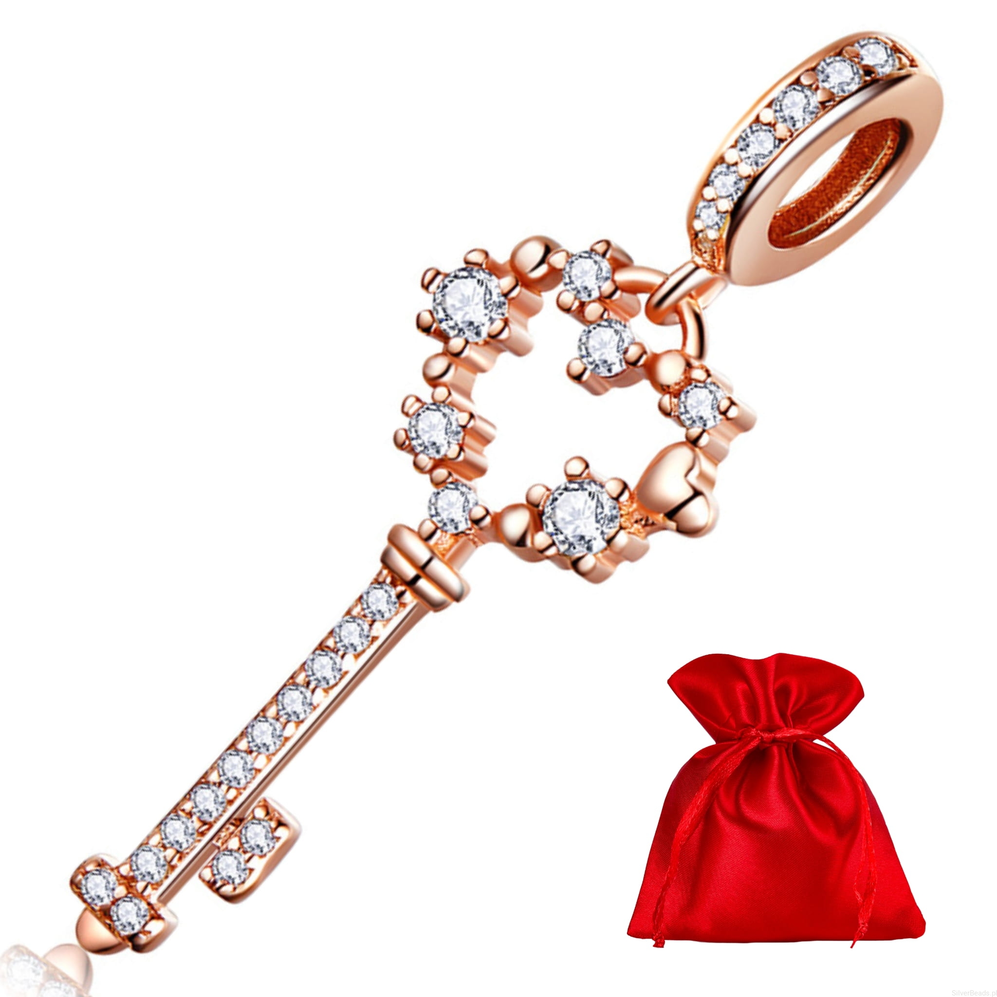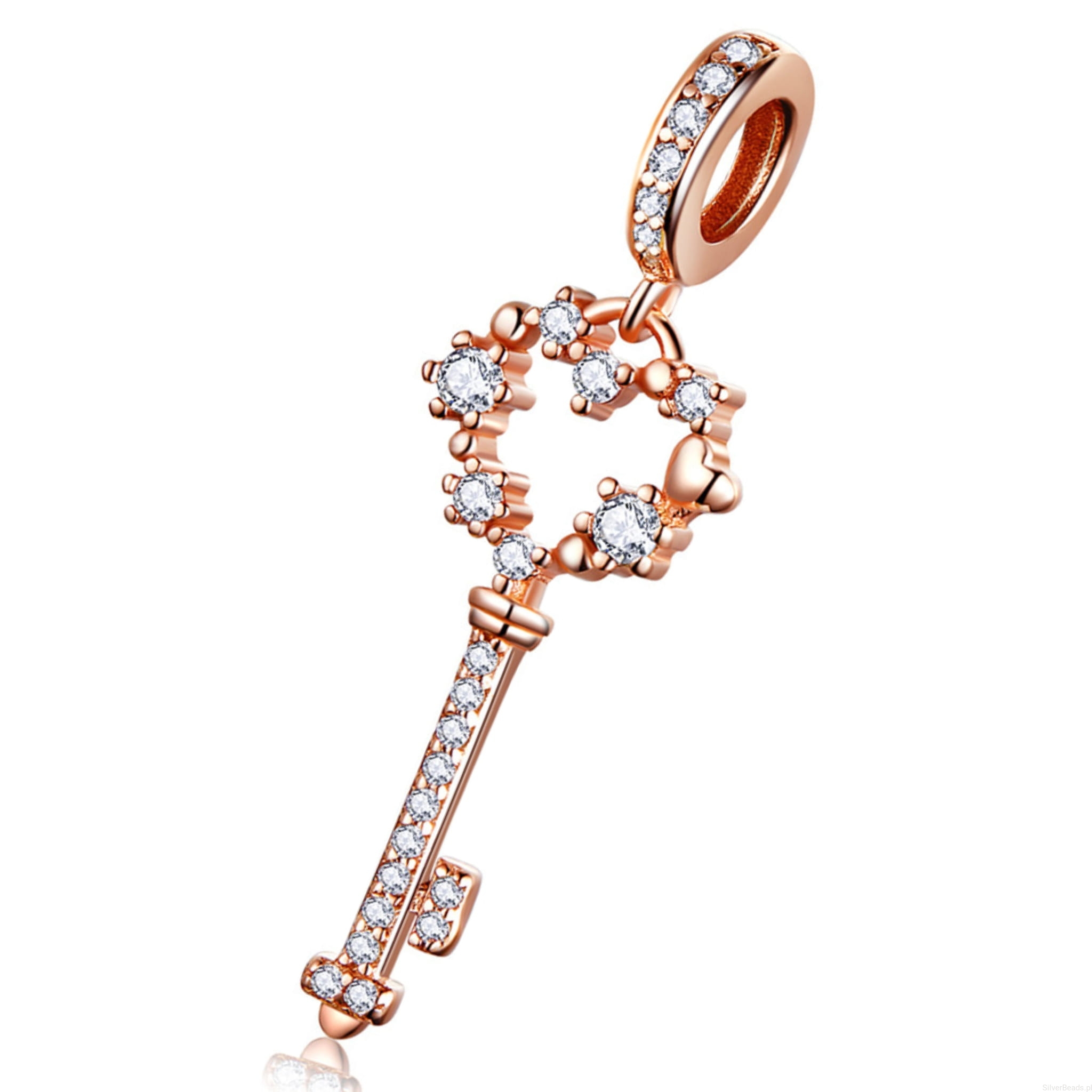 Srebrny charms: pozłacany klucz z sercem ozdobiony kryształkami.