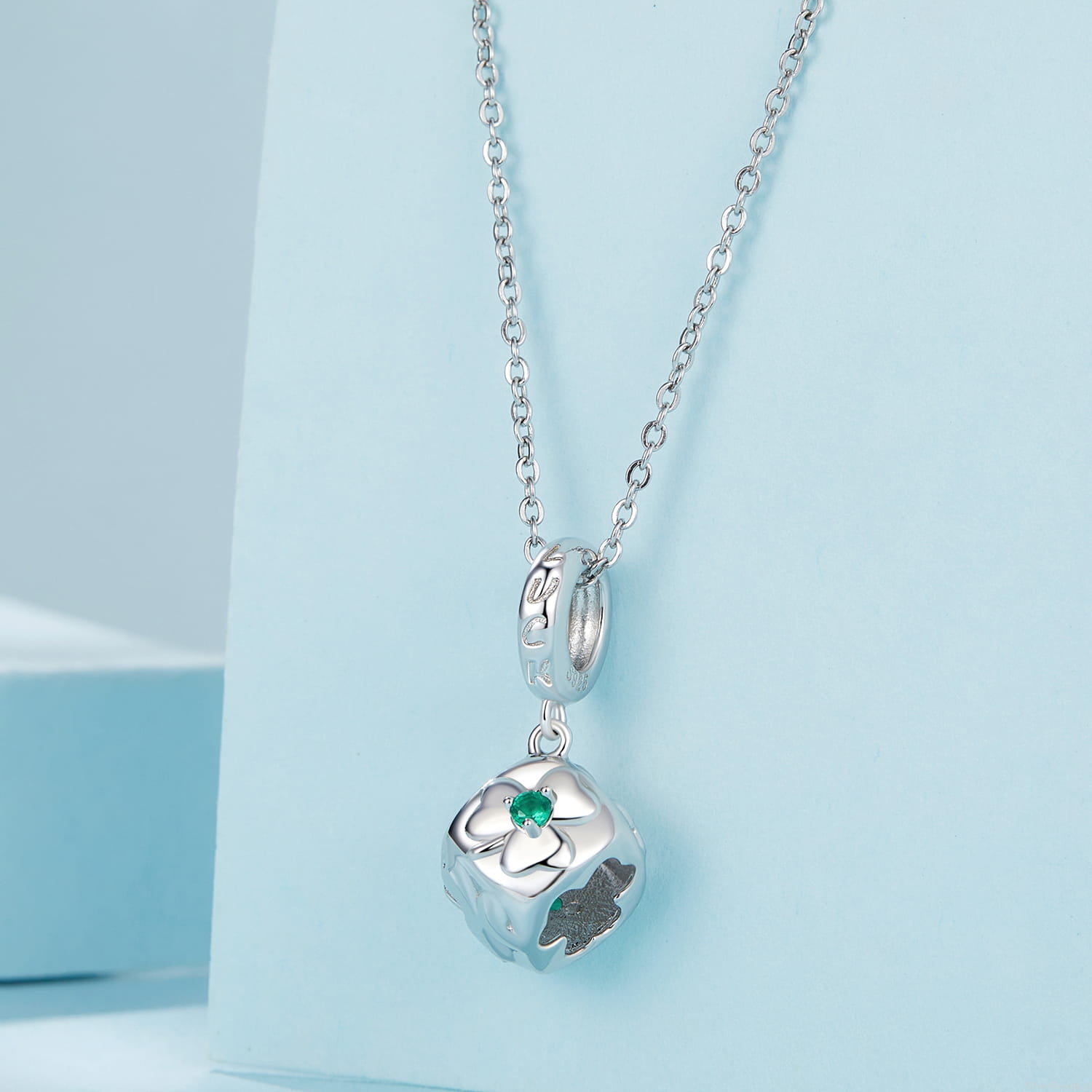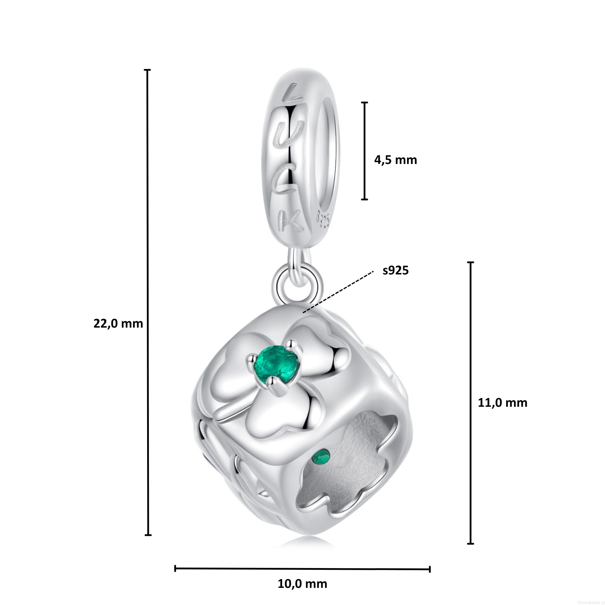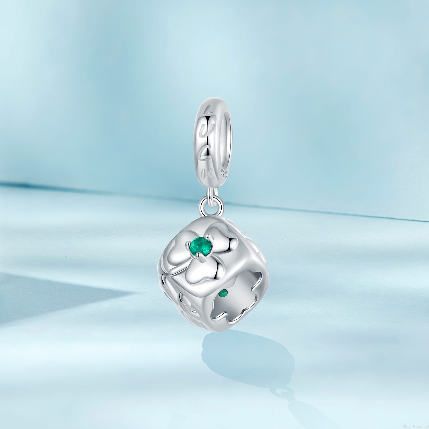 Srebrna zawieszka charms: Kostka z koniczynkami i grawerem.