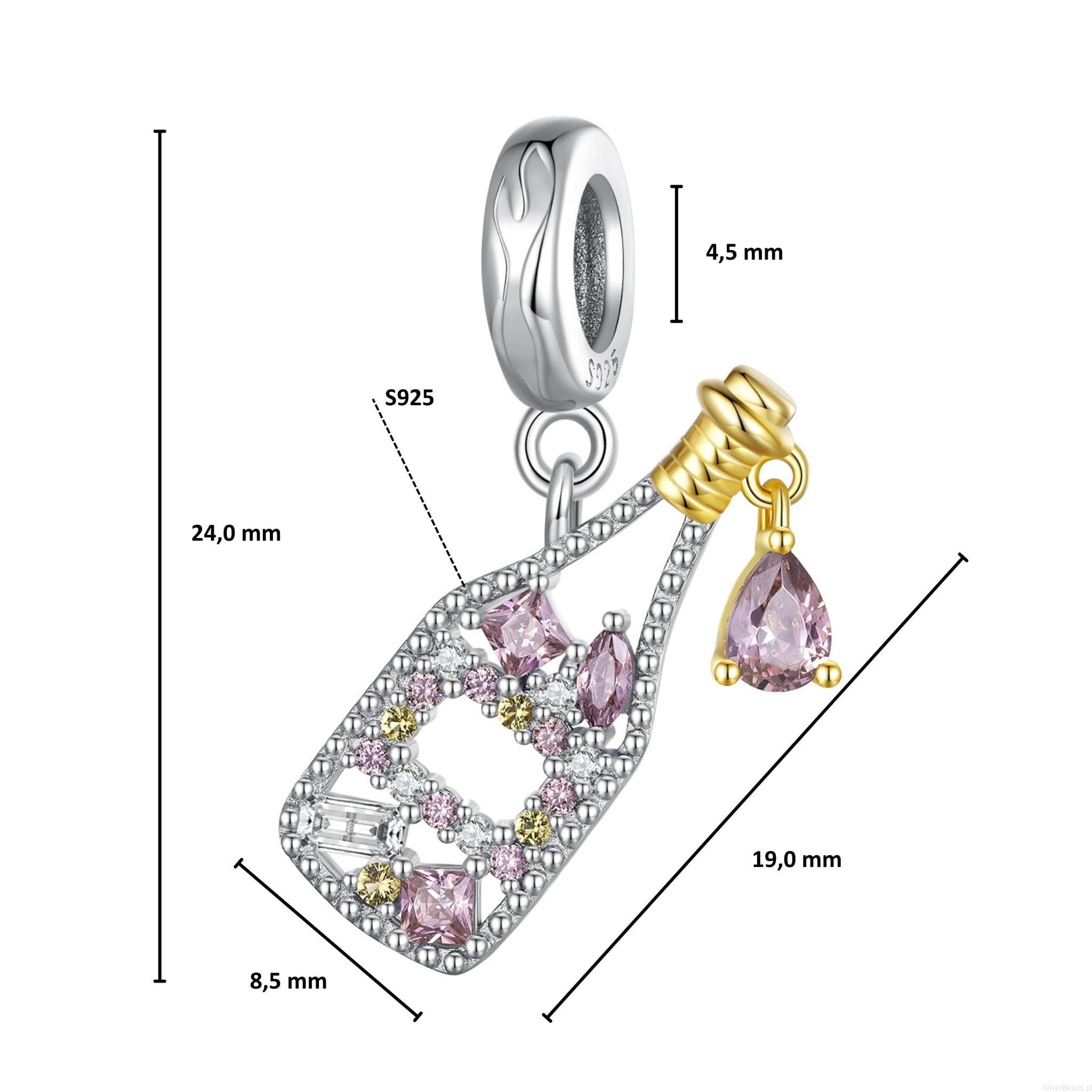 Srebrny charms: butelka szampana z pozłoceniami, ozdobiona kryształami.