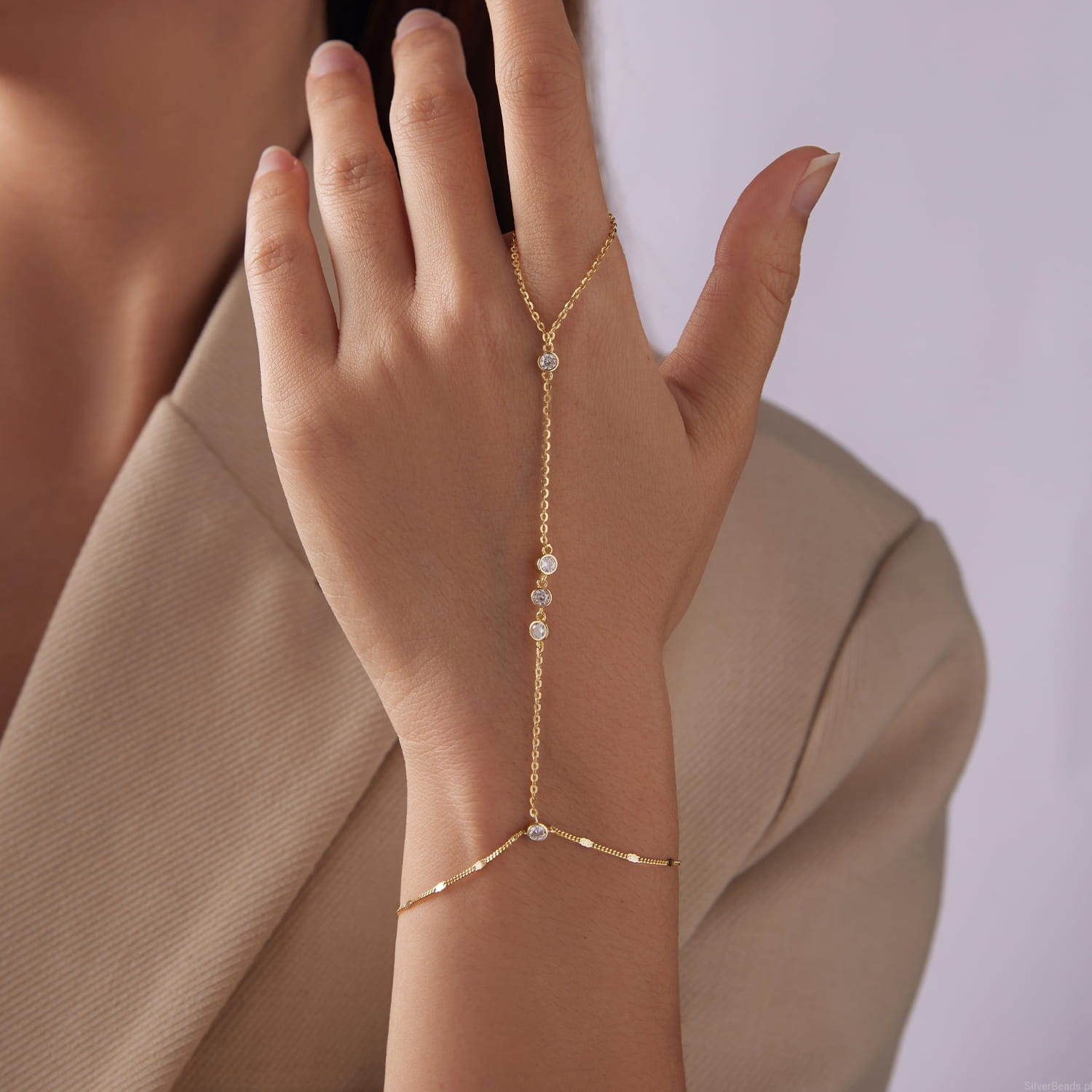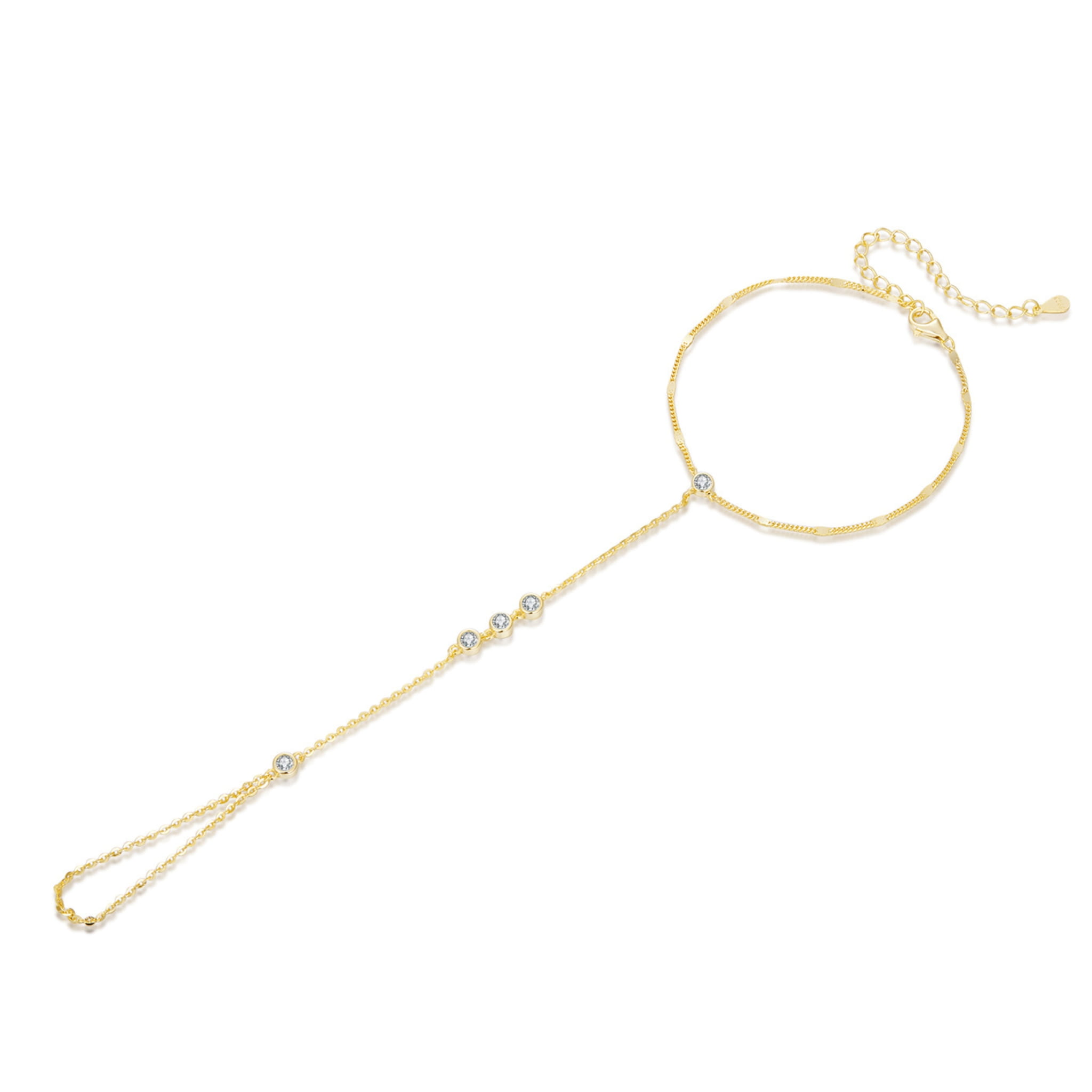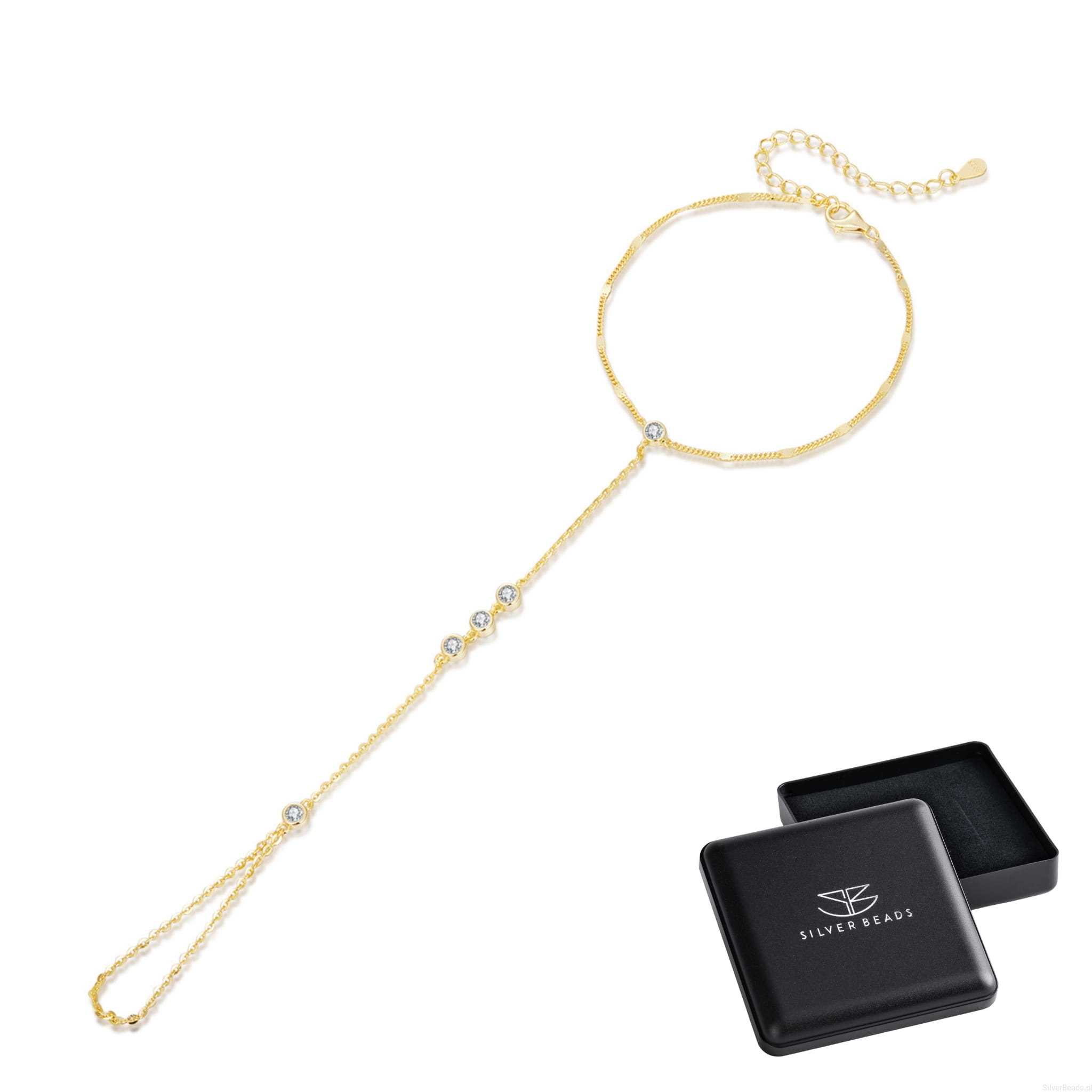 Pozłacana bransoletka na dłoń z delikatnymi cyrkoniami zachwyca lekkością i subtelnym blaskiem inspirowanym ciepłem słońca. Jej smukła linia symbolizuje elegancję, wdzięk i pewność siebie, a lśniące kamienie podkreślają wewnętrzne światło każdej kobiety. Zmysłowo oplata nadgarstek i dłoń, tworząc efektowną, a jednocześnie romantyczną ozdobę idealną na lato i wyjątkowe chwile. To doskonały wybór dla kobiety, która pragnie biżuterii przyciągającej spojrzenia i podkreślającej jej indywidualny styl.
