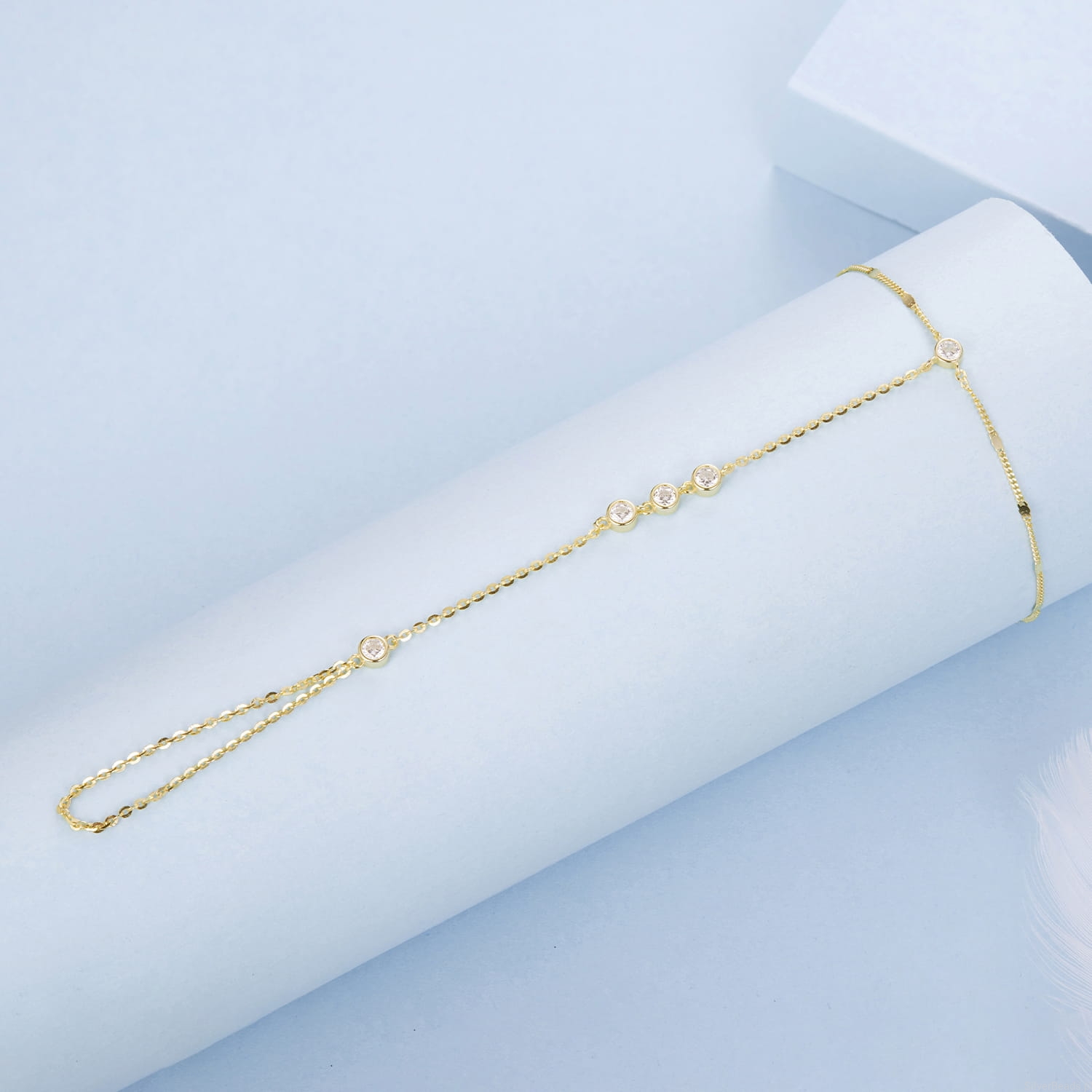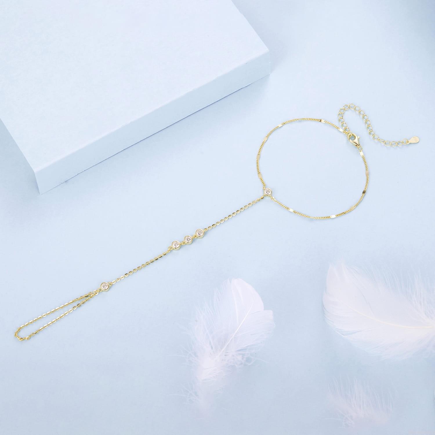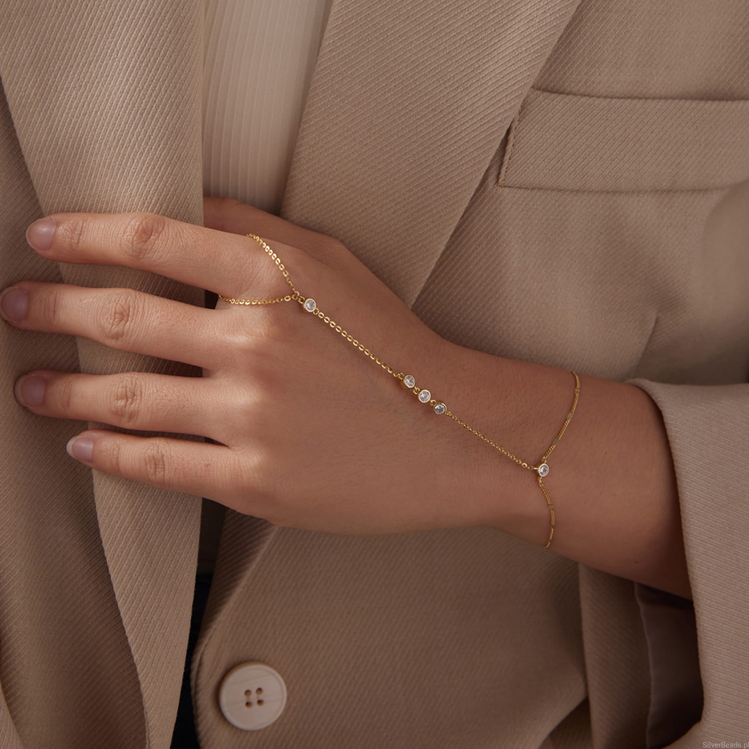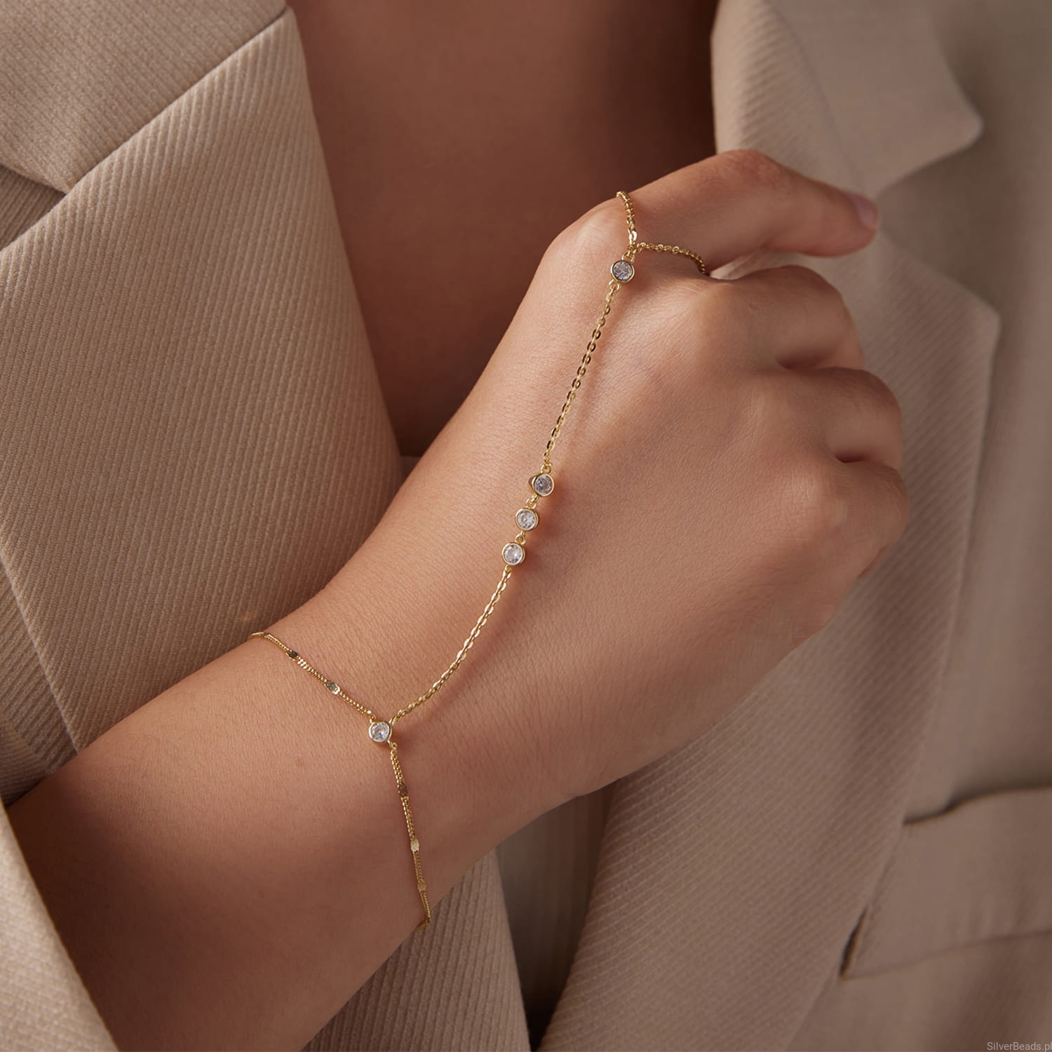 Pozłacana bransoletka na dłoń z delikatnymi cyrkoniami zachwyca lekkością i subtelnym blaskiem inspirowanym ciepłem słońca. Jej smukła linia symbolizuje elegancję, wdzięk i pewność siebie, a lśniące kamienie podkreślają wewnętrzne światło każdej kobiety. Zmysłowo oplata nadgarstek i dłoń, tworząc efektowną, a jednocześnie romantyczną ozdobę idealną na lato i wyjątkowe chwile. To doskonały wybór dla kobiety, która pragnie biżuterii przyciągającej spojrzenia i podkreślającej jej indywidualny styl.