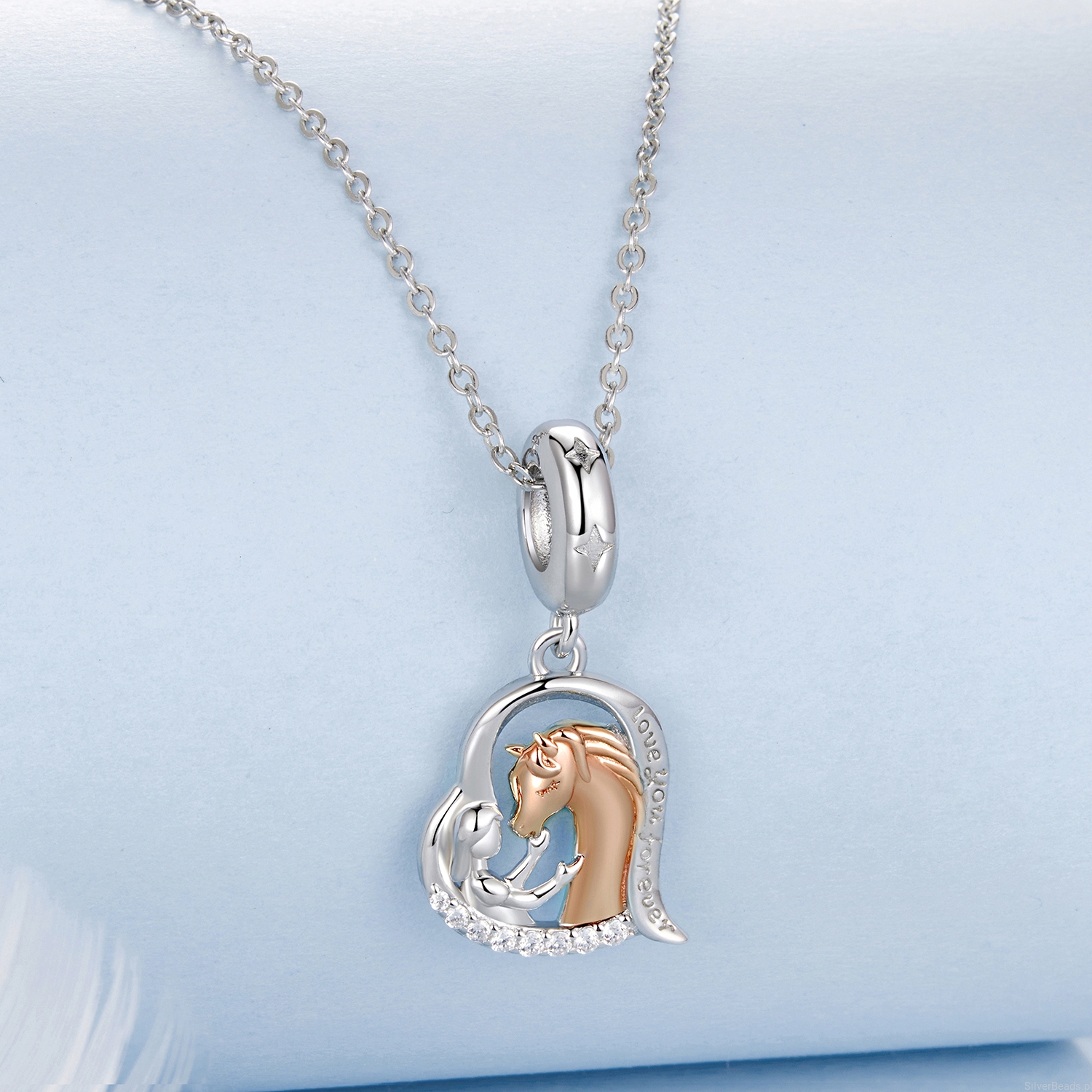 Ten charms przedstawia wzruszającą scenę dziewczynki i konia zamkniętą w delikatnym sercu. Symbolizuje wolność, zaufanie i niezwykłą więź między człowiekiem a naturą, pełną czułości i spokoju. Subtelne detale oraz napis love you forever podkreślają trwałość uczuć i piękno relacji, które pozostają na zawsze. To wyjątkowy prezent dla miłośniczki koni lub bliskiej osoby, który niesie ze sobą emocje i wspomnienia.
