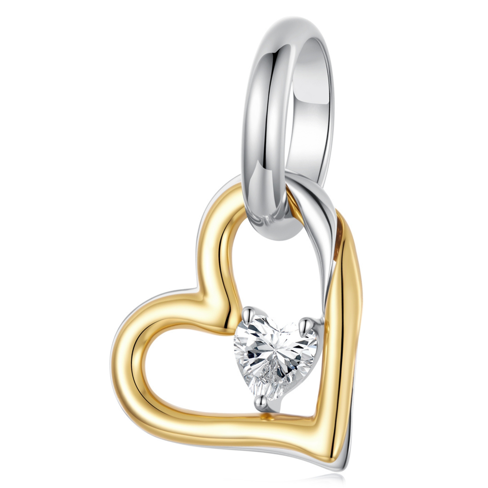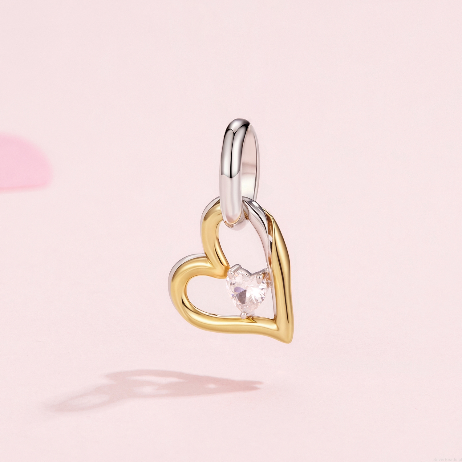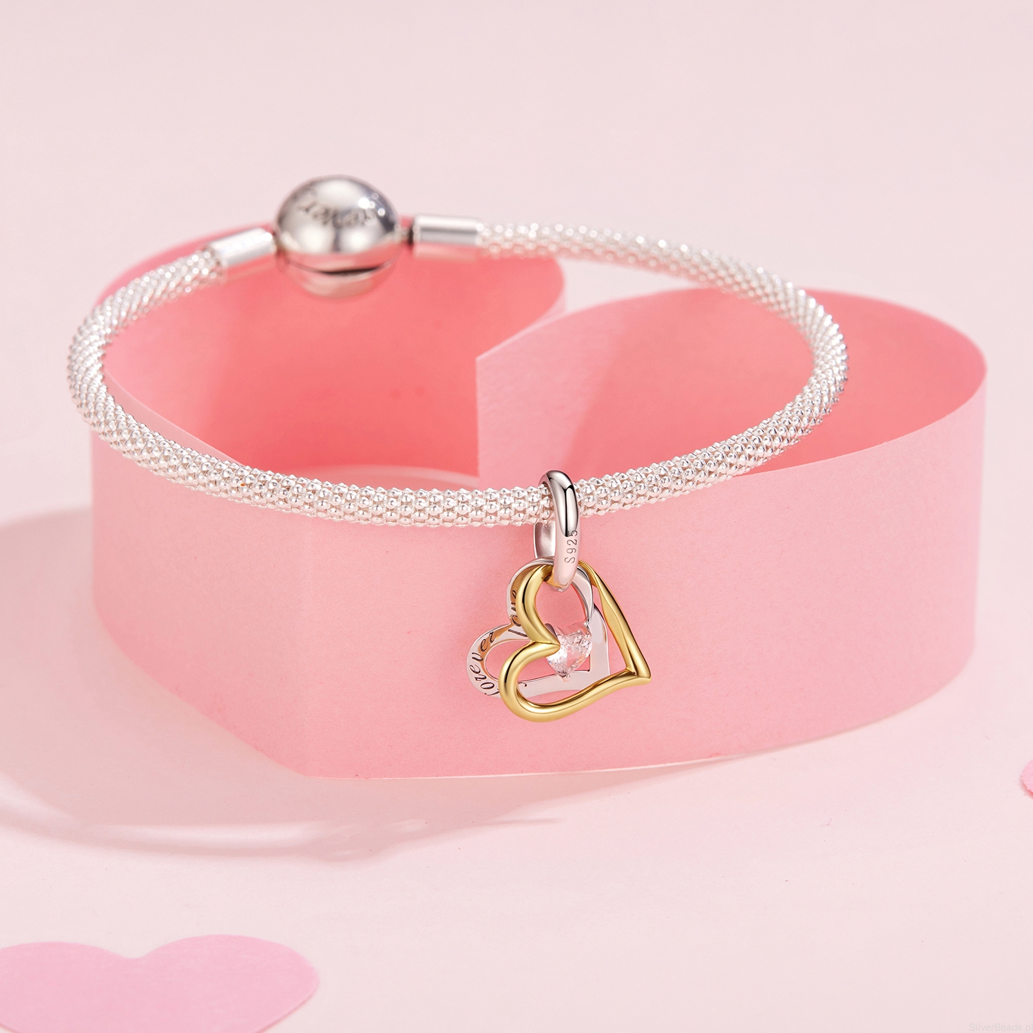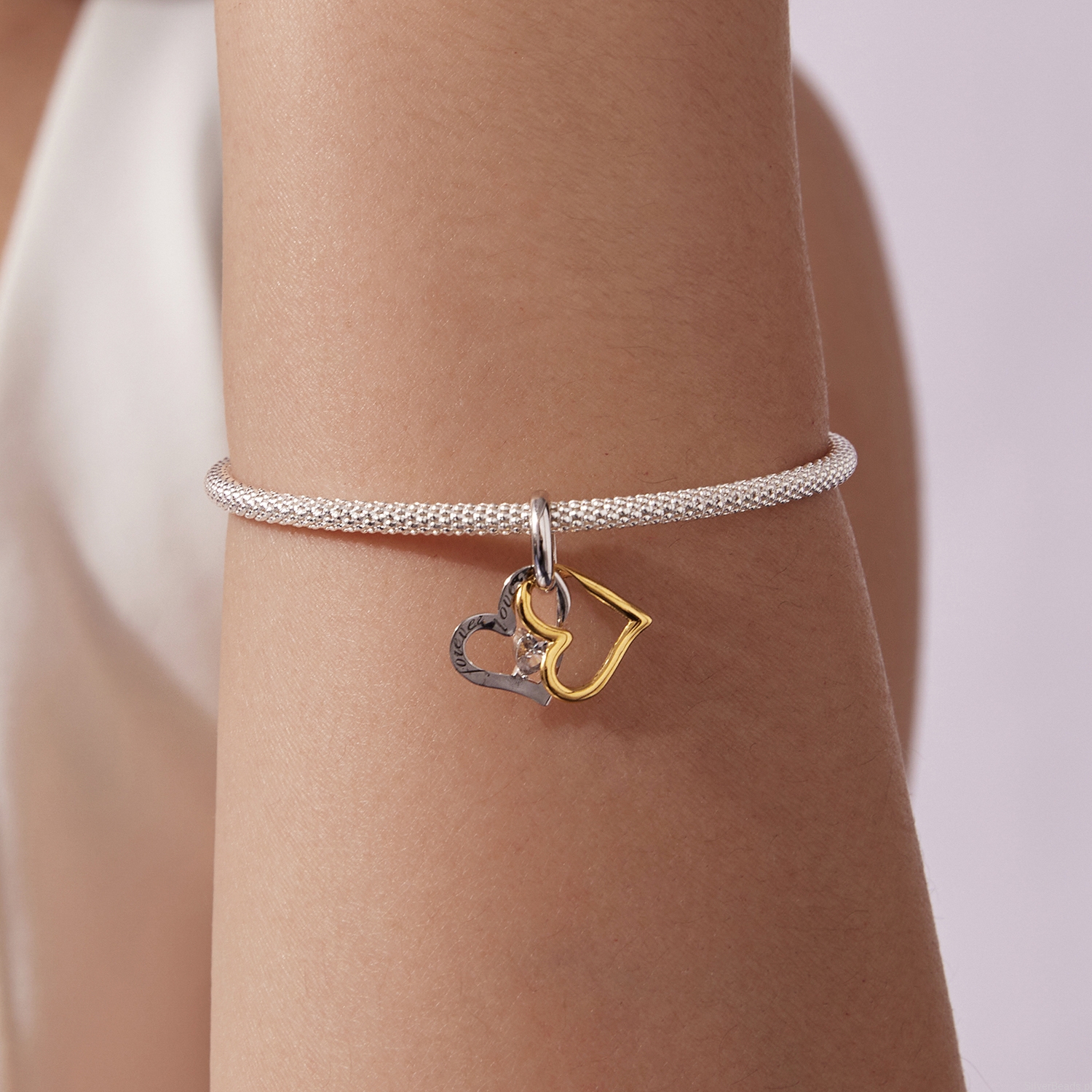 Ten charms z dwoma splecionymi sercami symbolizuje bezwarunkową miłość i wyjątkową więź między mamą a dzieckiem. Połączenie srebra i złota odzwierciedla ciepło, troskę i siłę rodzinnych relacji. Delikatny kamień dodaje mu blasku, przypominając o codziennej wdzięczności i bliskości. To piękny prezent dla mamy, który wyrazi więcej niż słowa.
