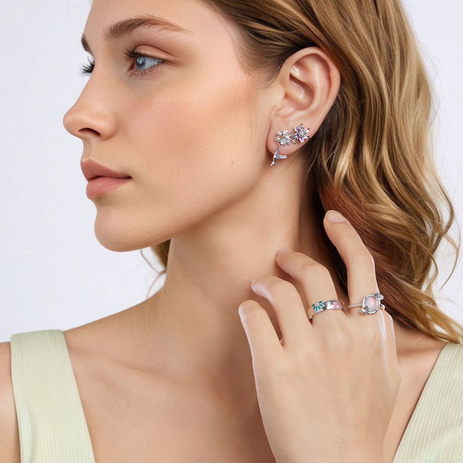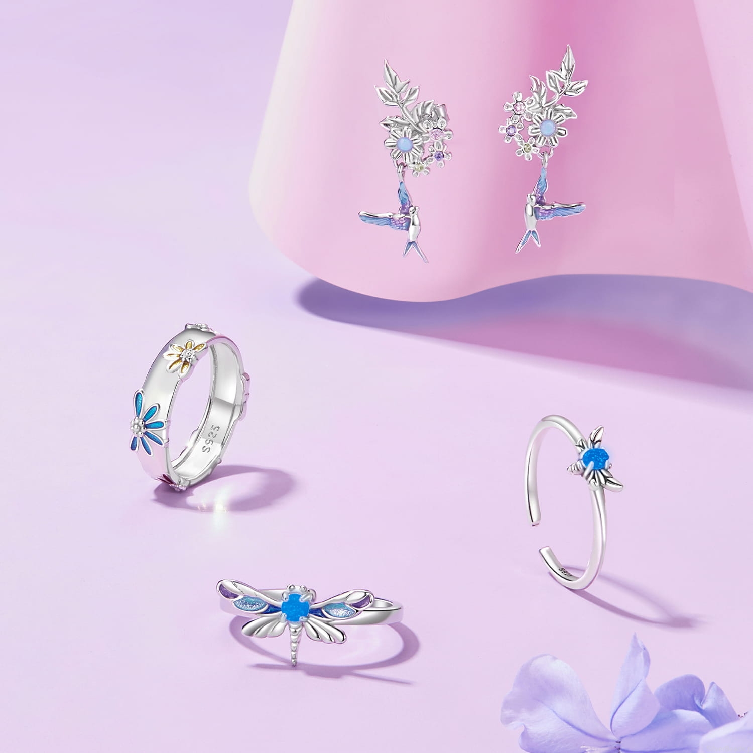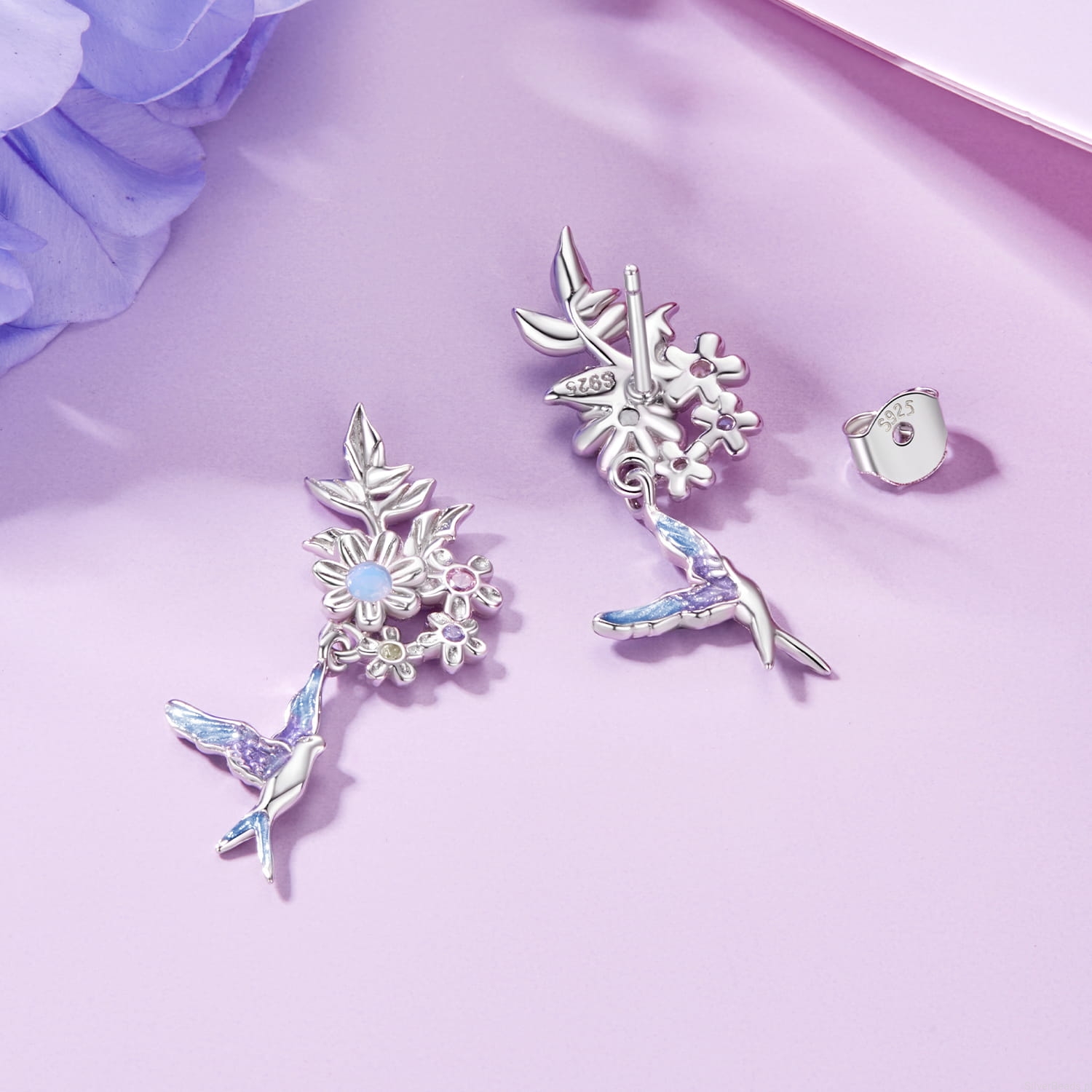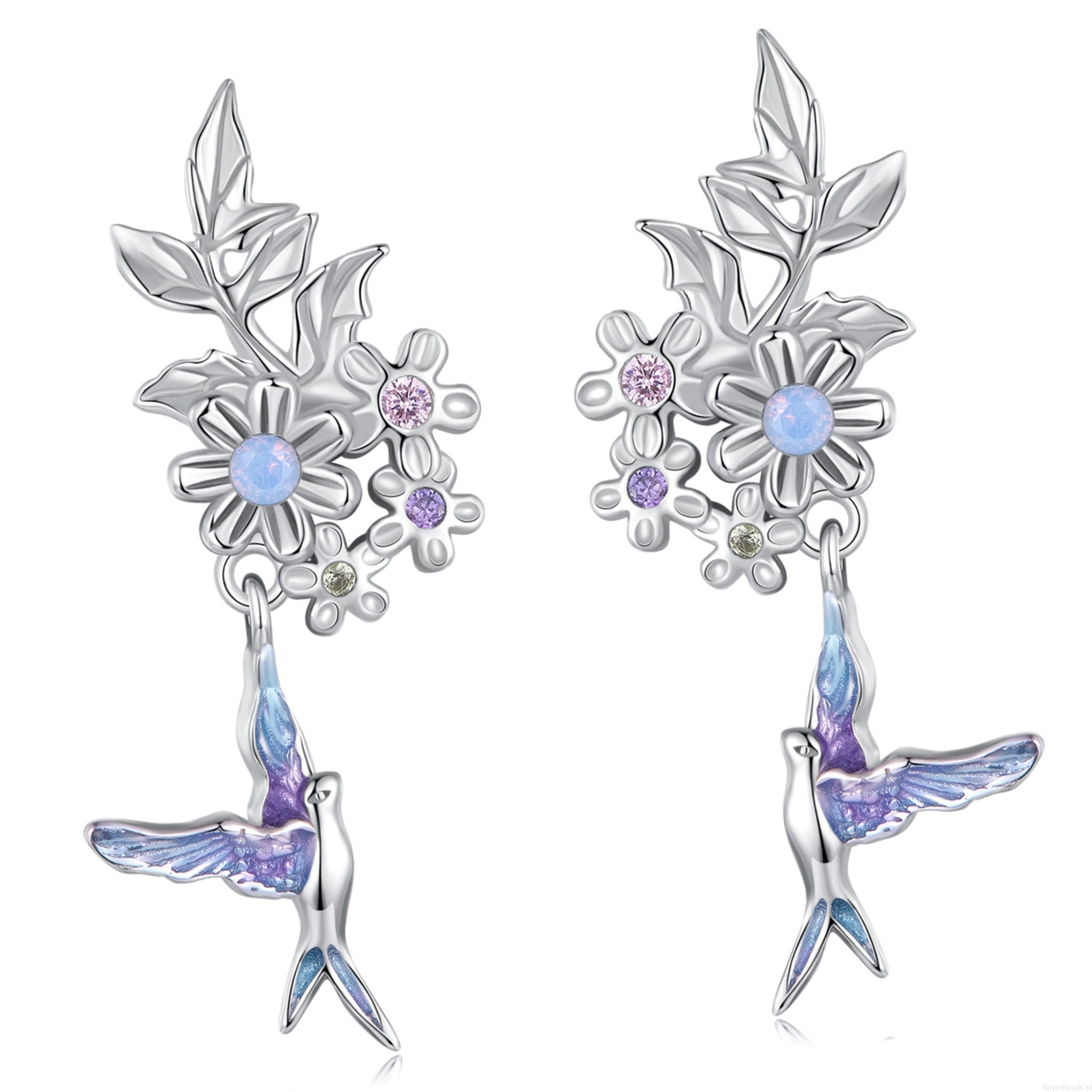 Srebrne kolczyki kolibry z kwiatkami sztyfty srebro 925