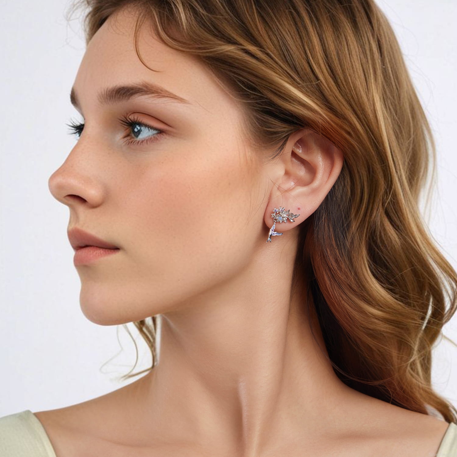 Srebrne kolczyki sztyfty: kolibry z kryształowymi kwiatkami.