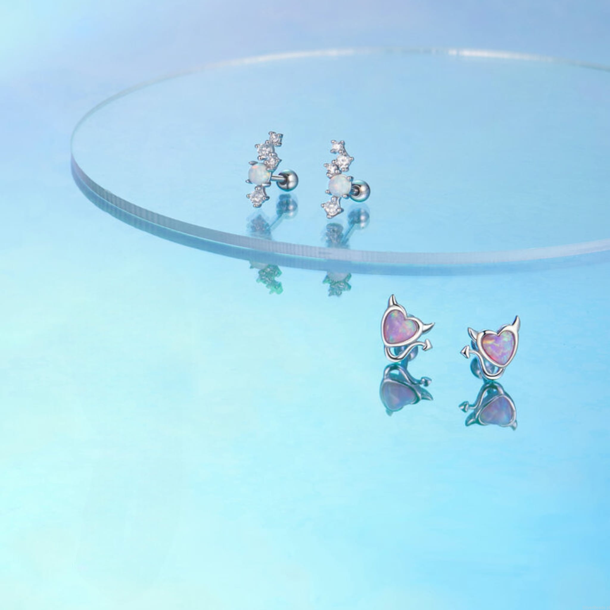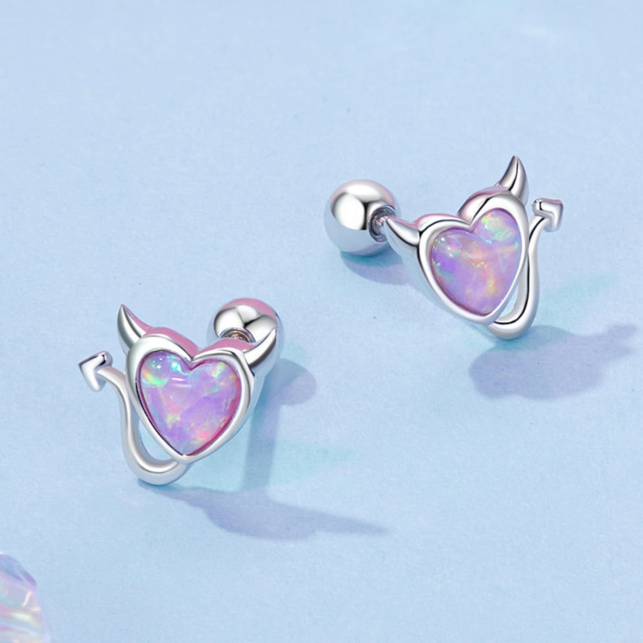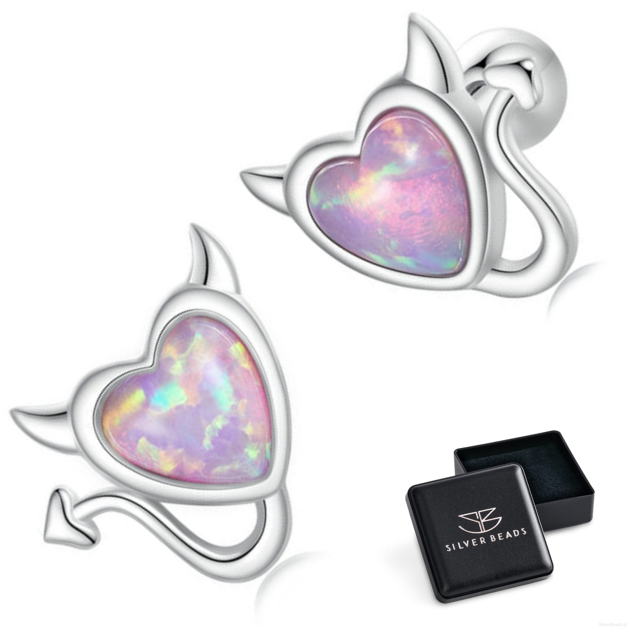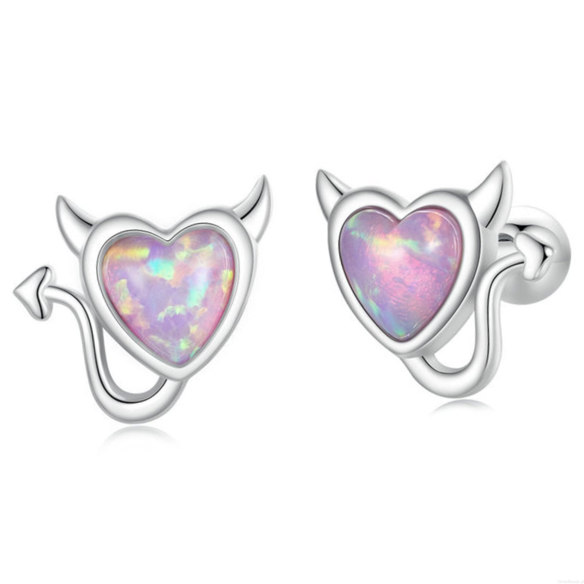Srebrne kolczyki serca z rogami z opalizujących kryształów sztyfty zakręcane srebro 925