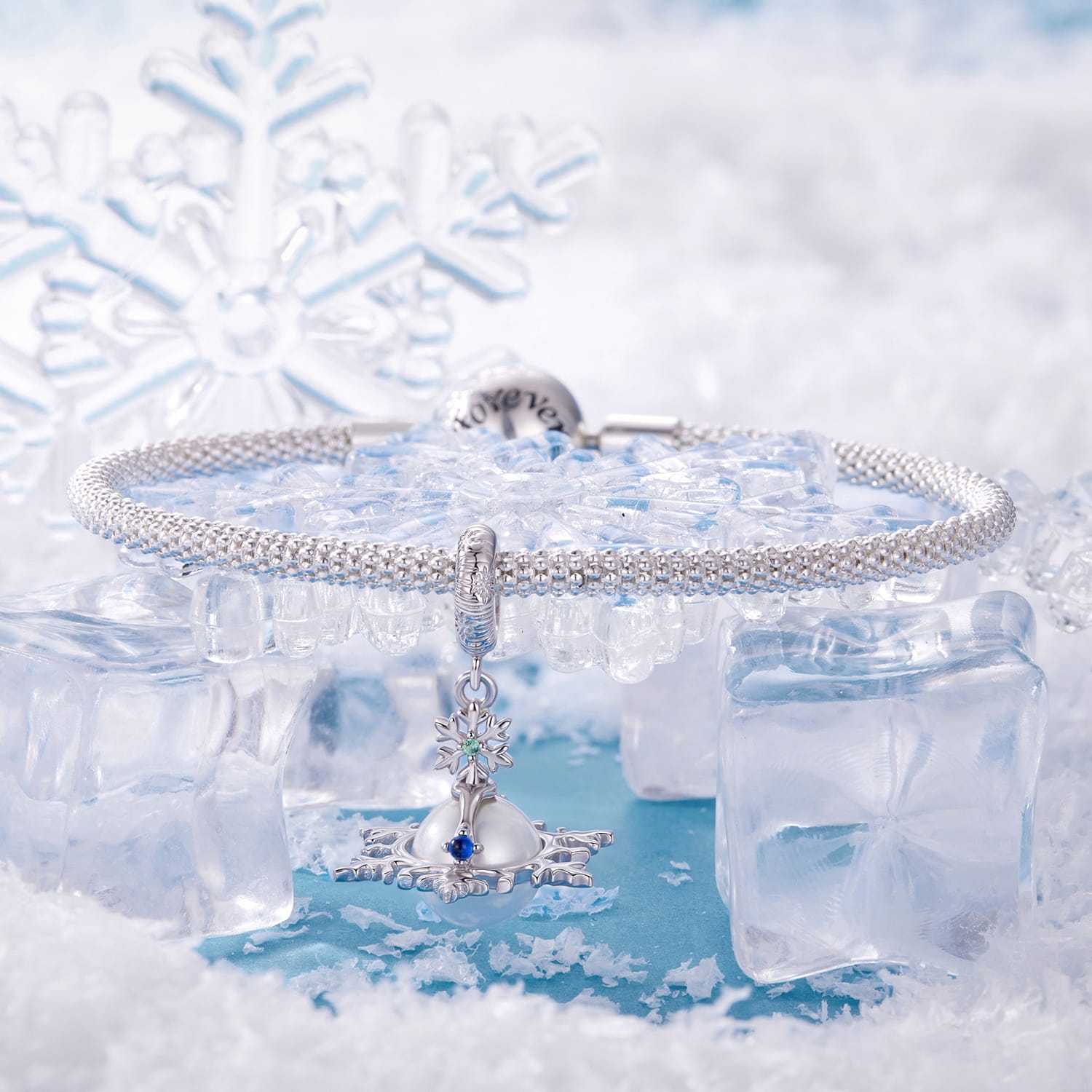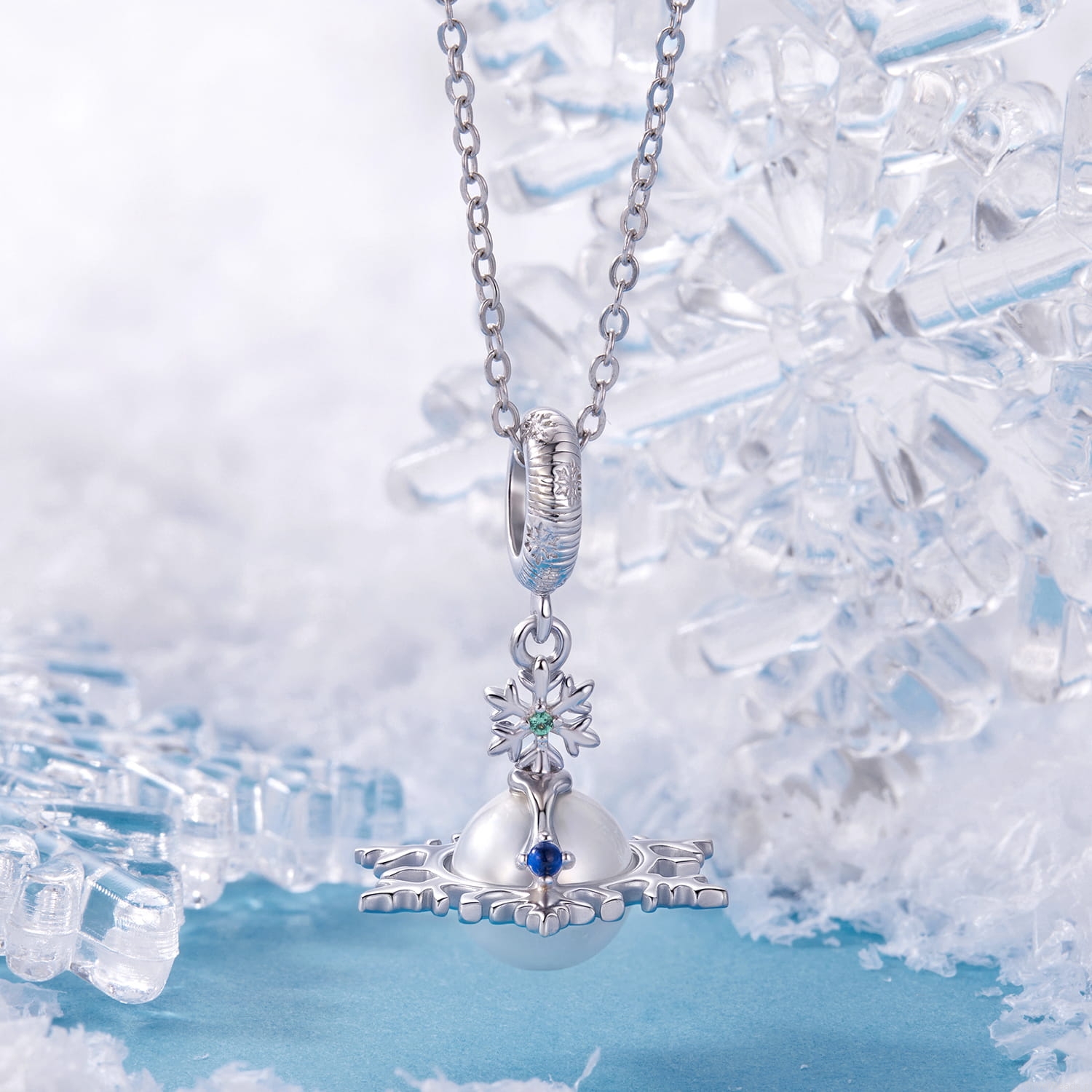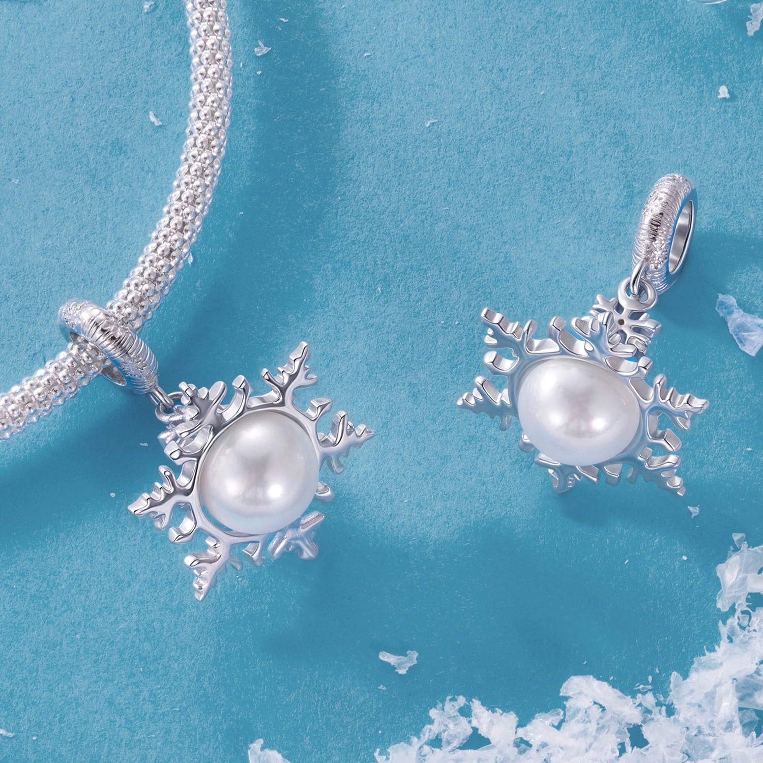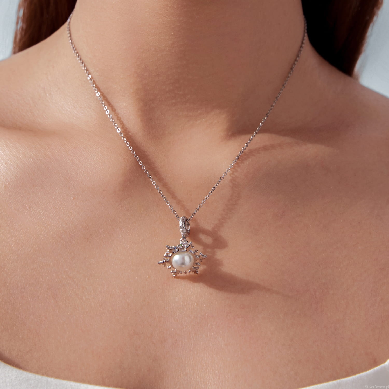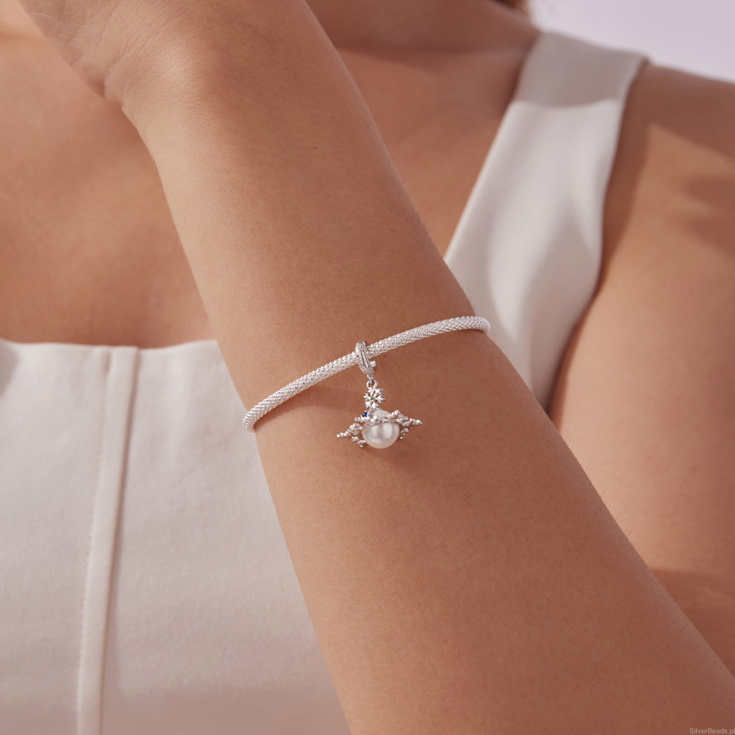 Srebrna zawieszka charms: śnieżynka z perełką.