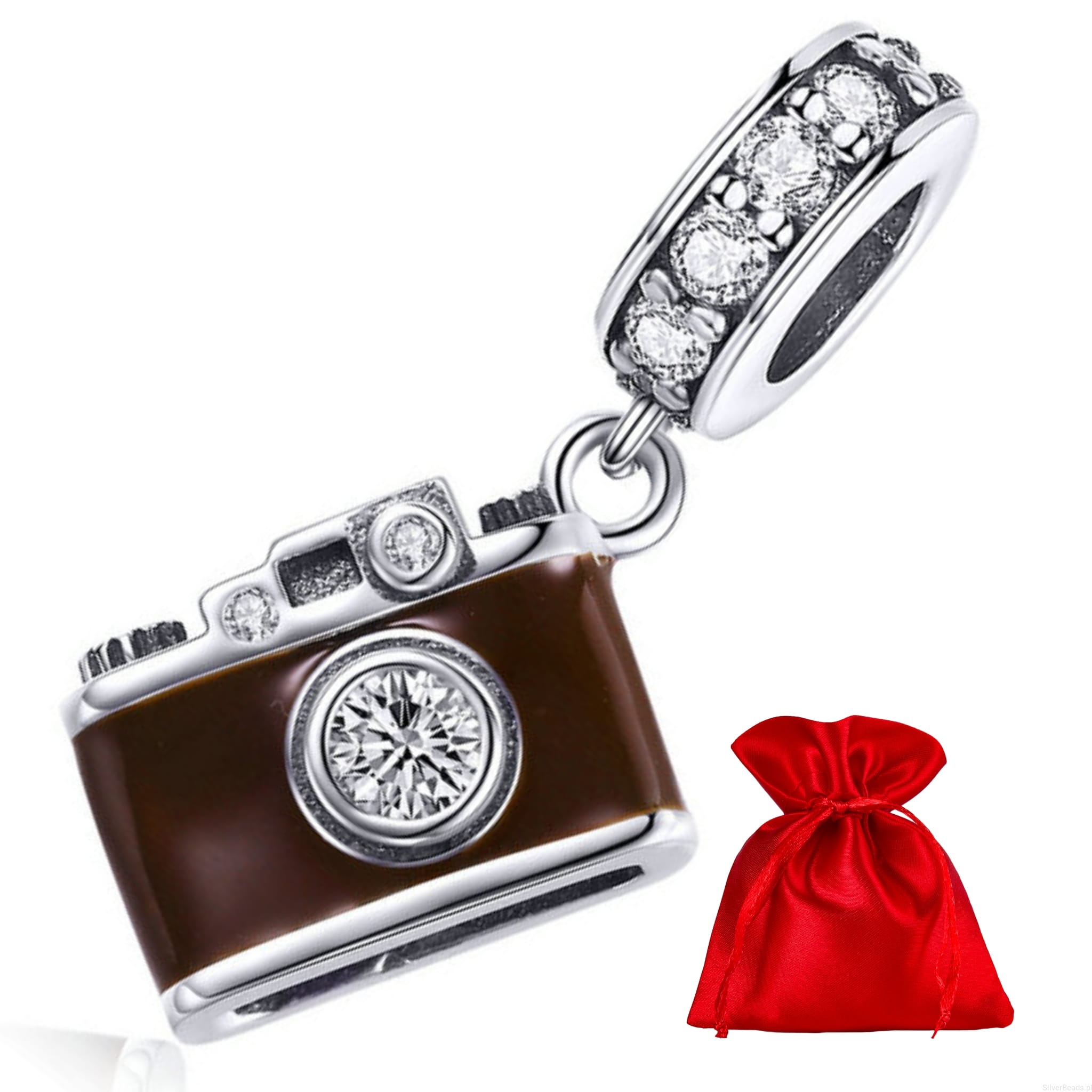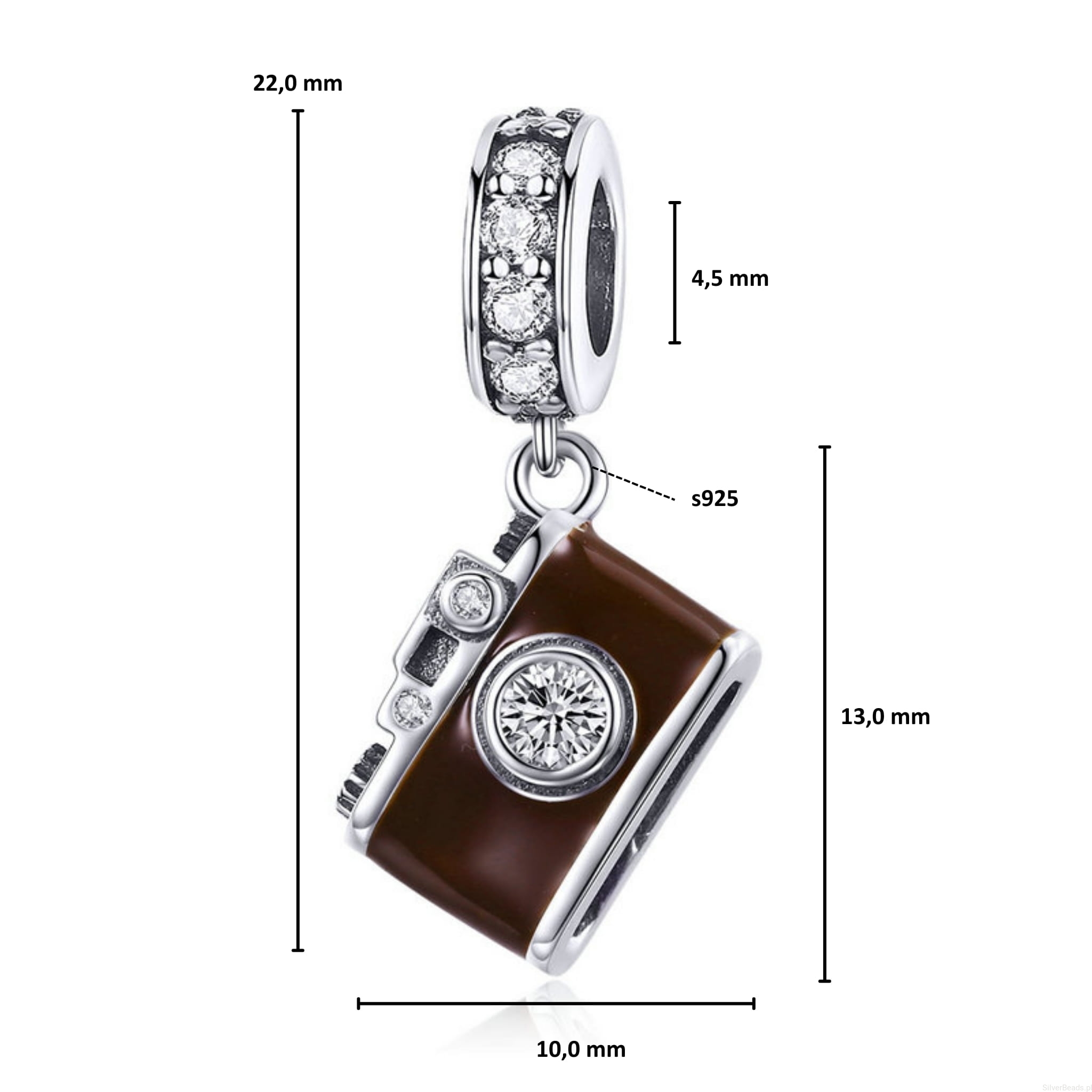 Srebrna zawieszka charms: aparat ozdobiony kryształami.