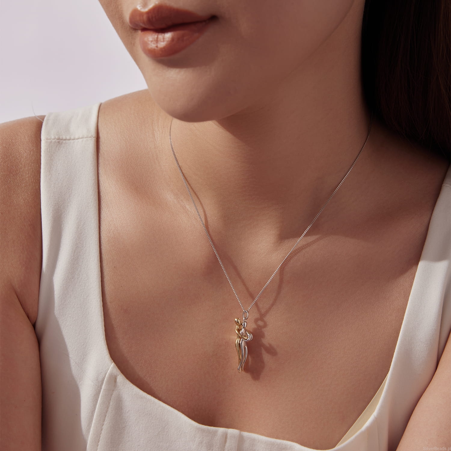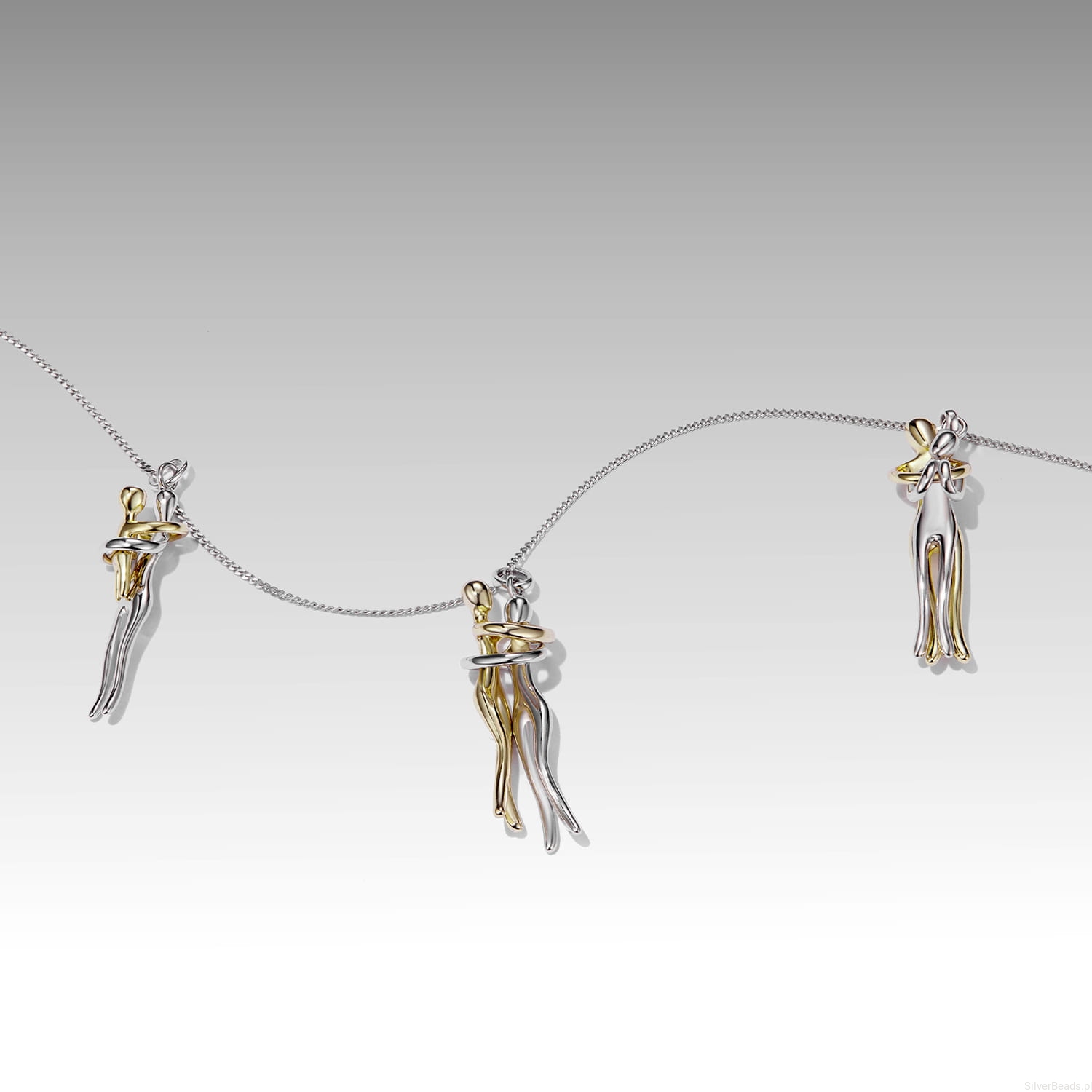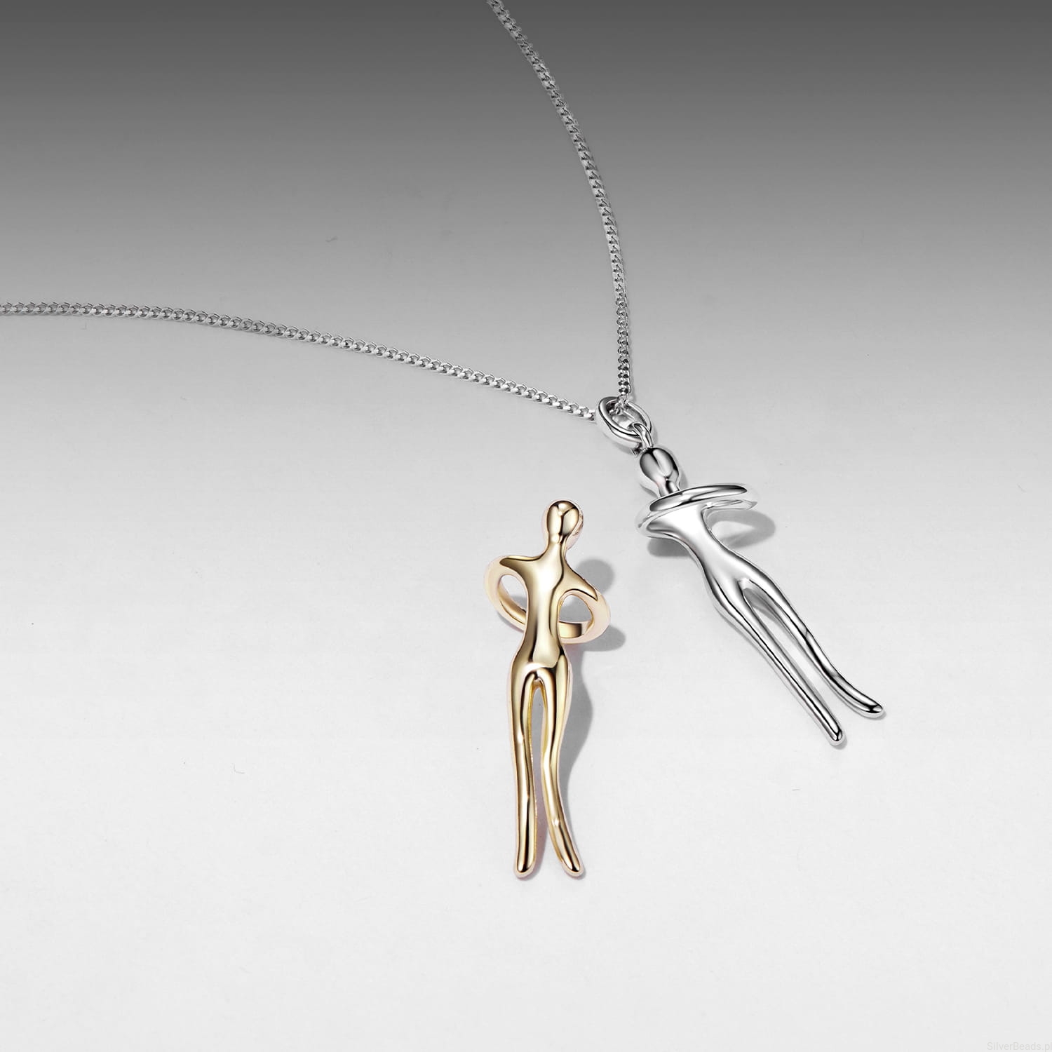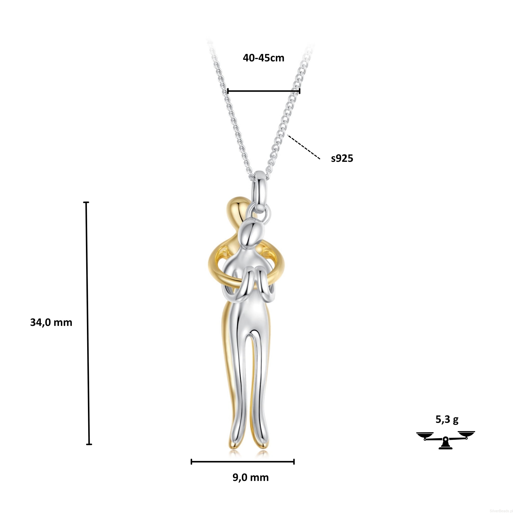 Wyjątkowy srebrny naszyjnik przedstawiający splecioną parę w czułym objęciu to subtelny symbol miłości, jedności i wzajemnego wsparcia. Kontrast dwóch kolorów – chłodnego srebra i ciepłego złotego akcentu – podkreśla harmonię dwóch osób, które mimo różnic tworzą nierozerwalną całość. Minimalistyczna, nowoczesna forma nadaje biżuterii elegancki i ponadczasowy charakter. To idealny prezent dla ukochanej osoby – na rocznicę, Walentynki lub jako wyraz głębokiego uczucia.