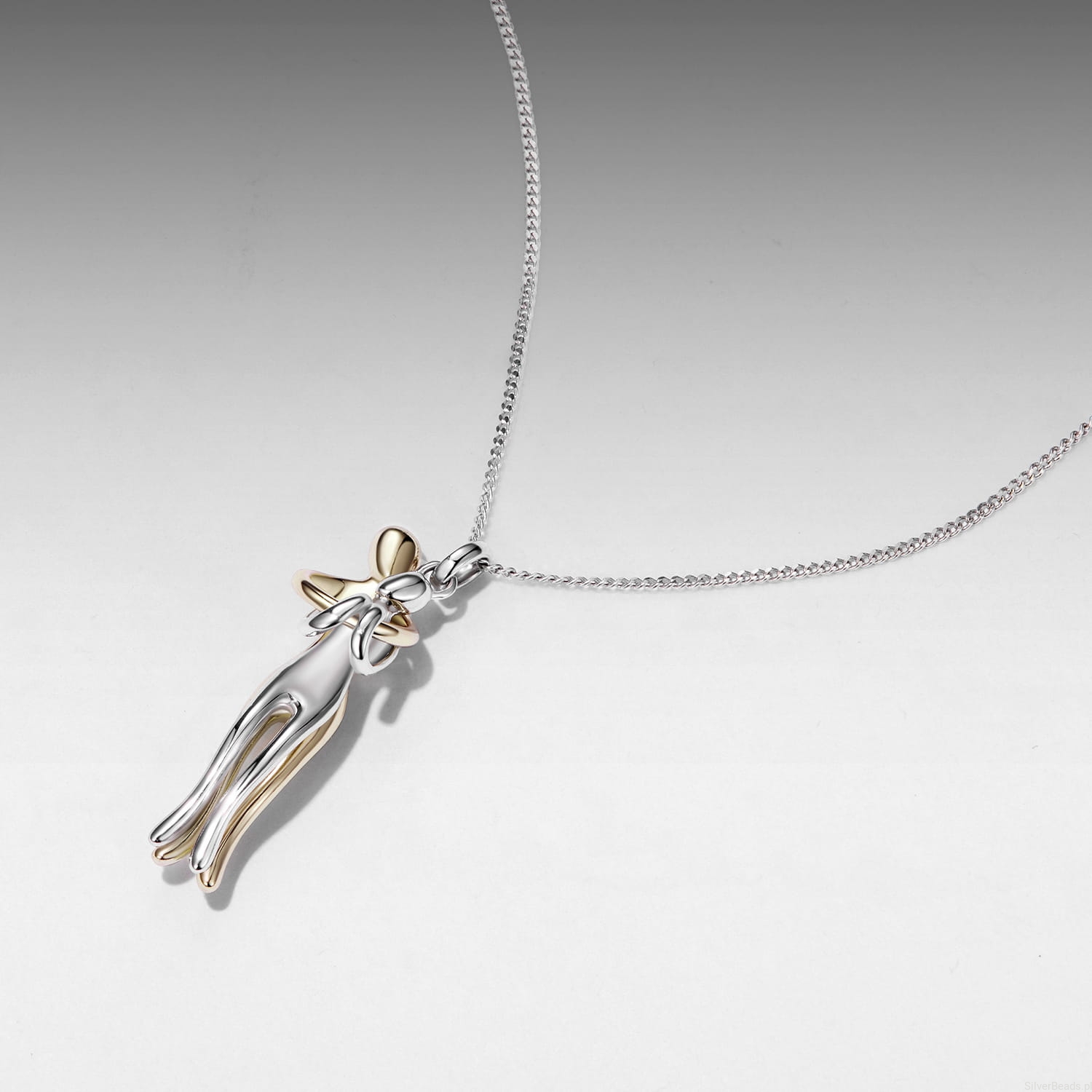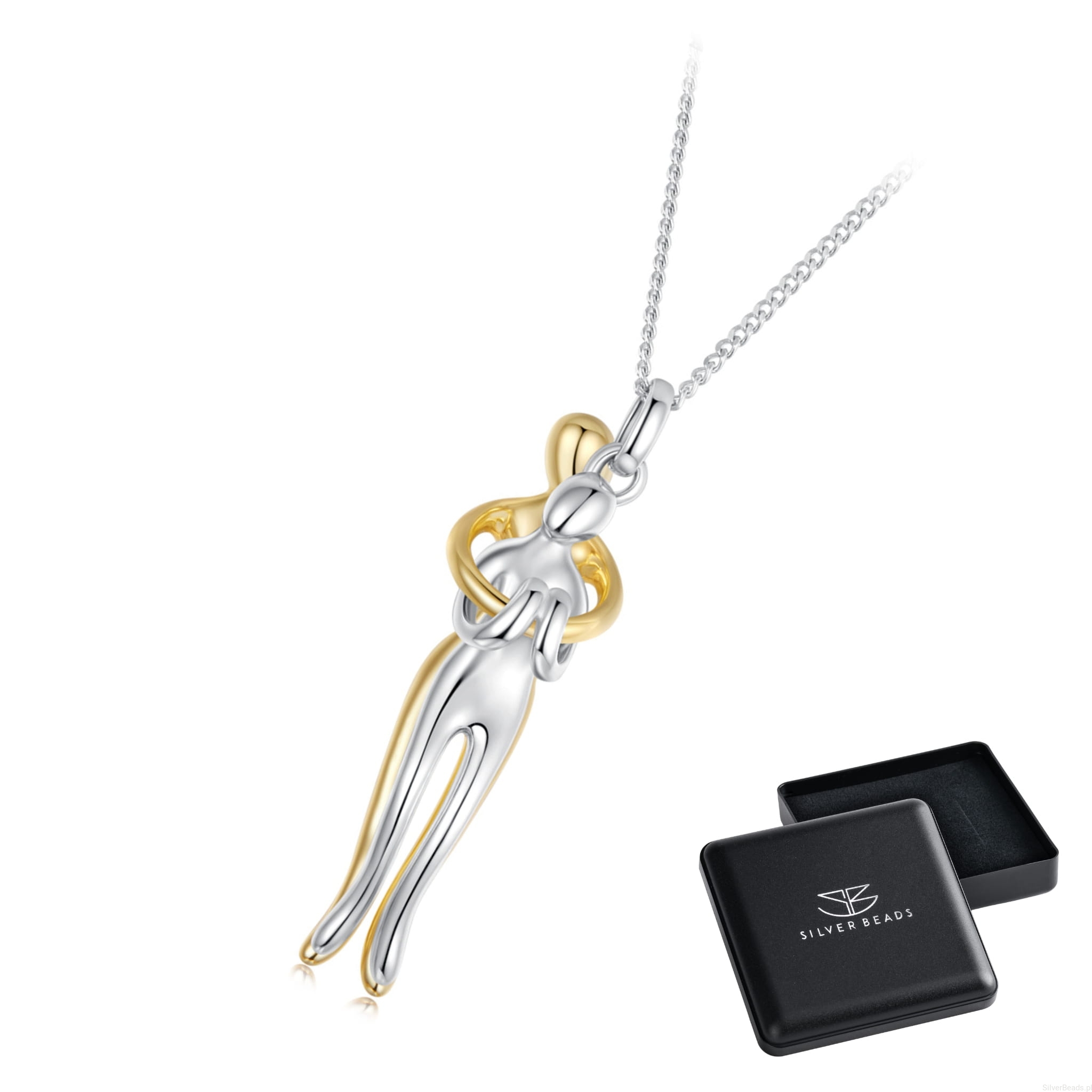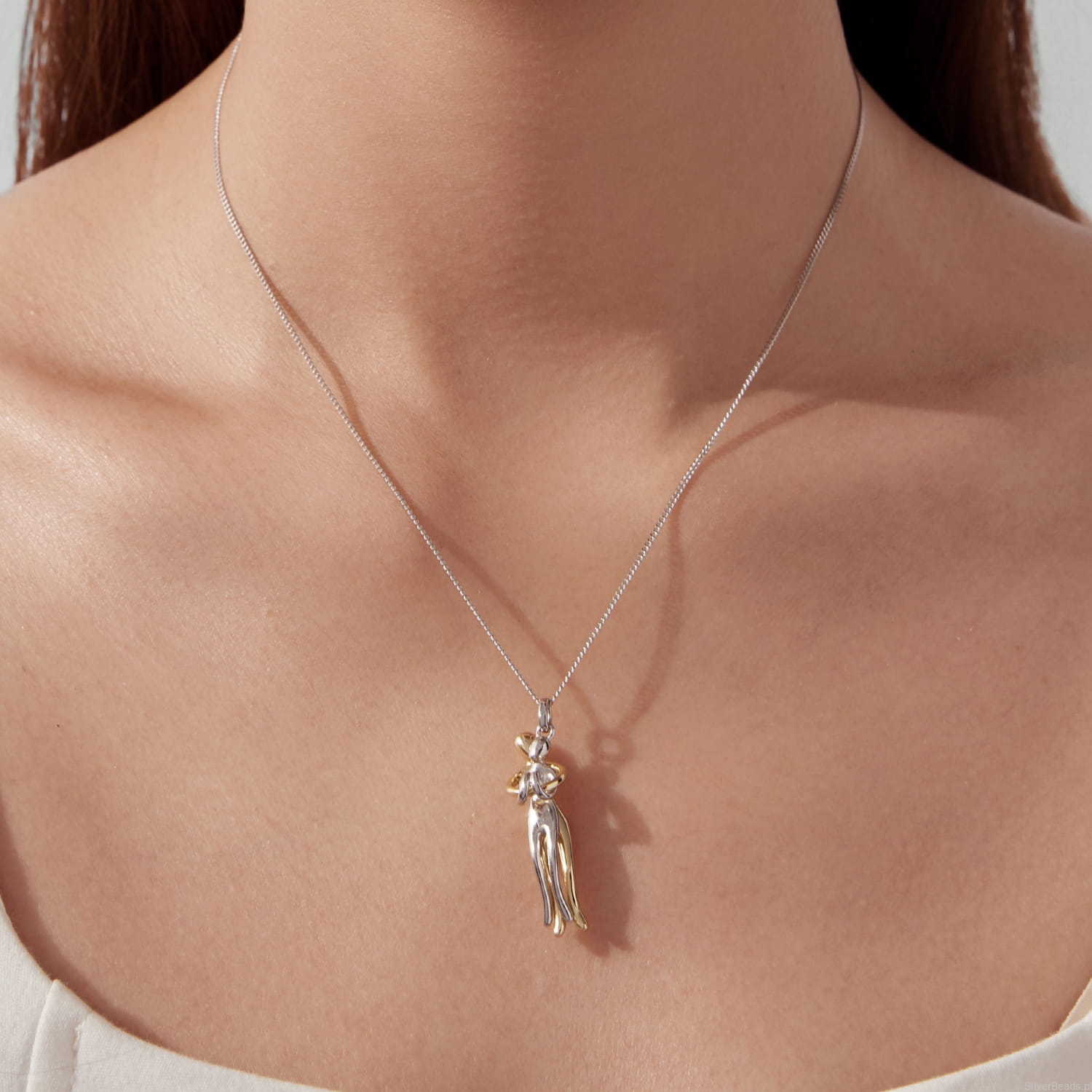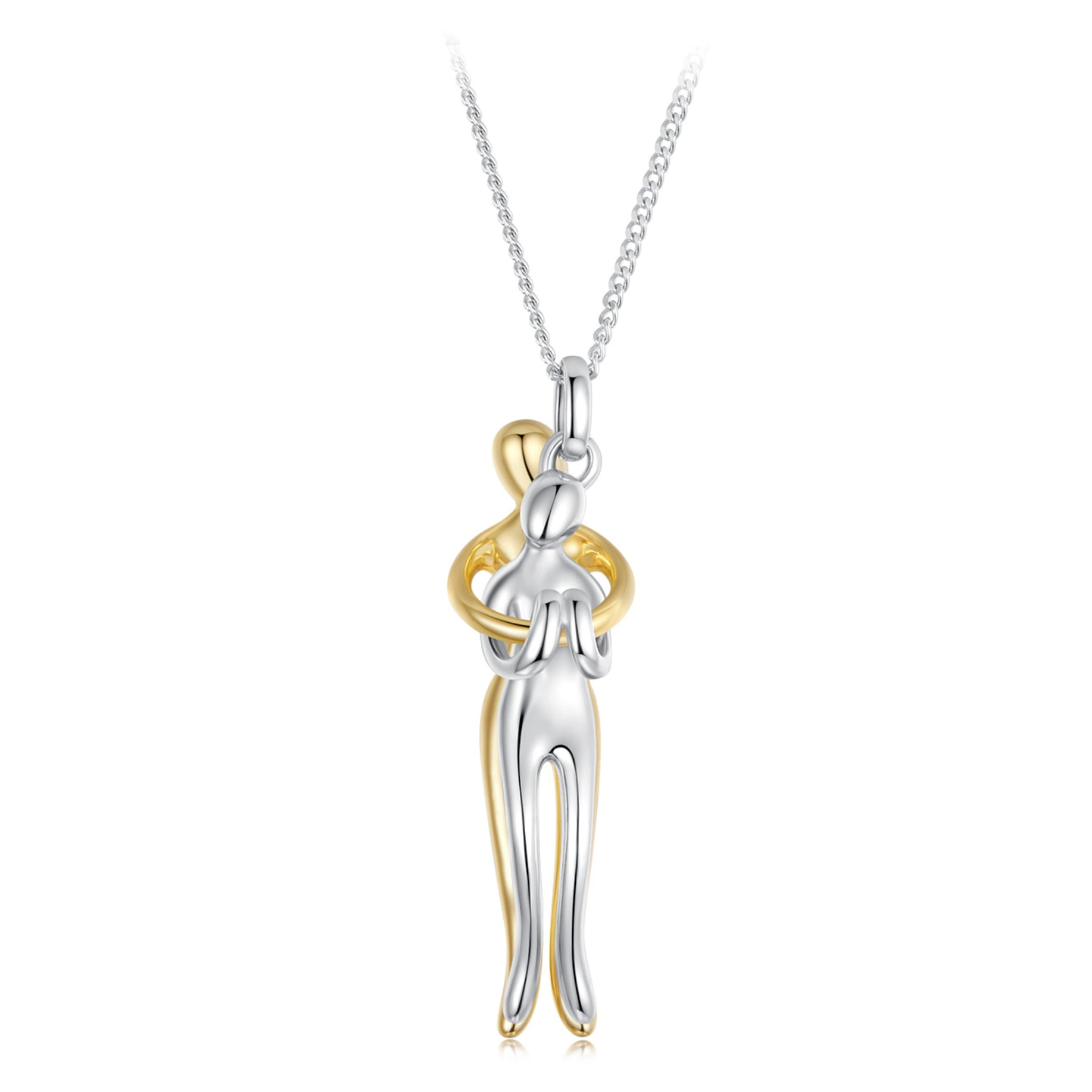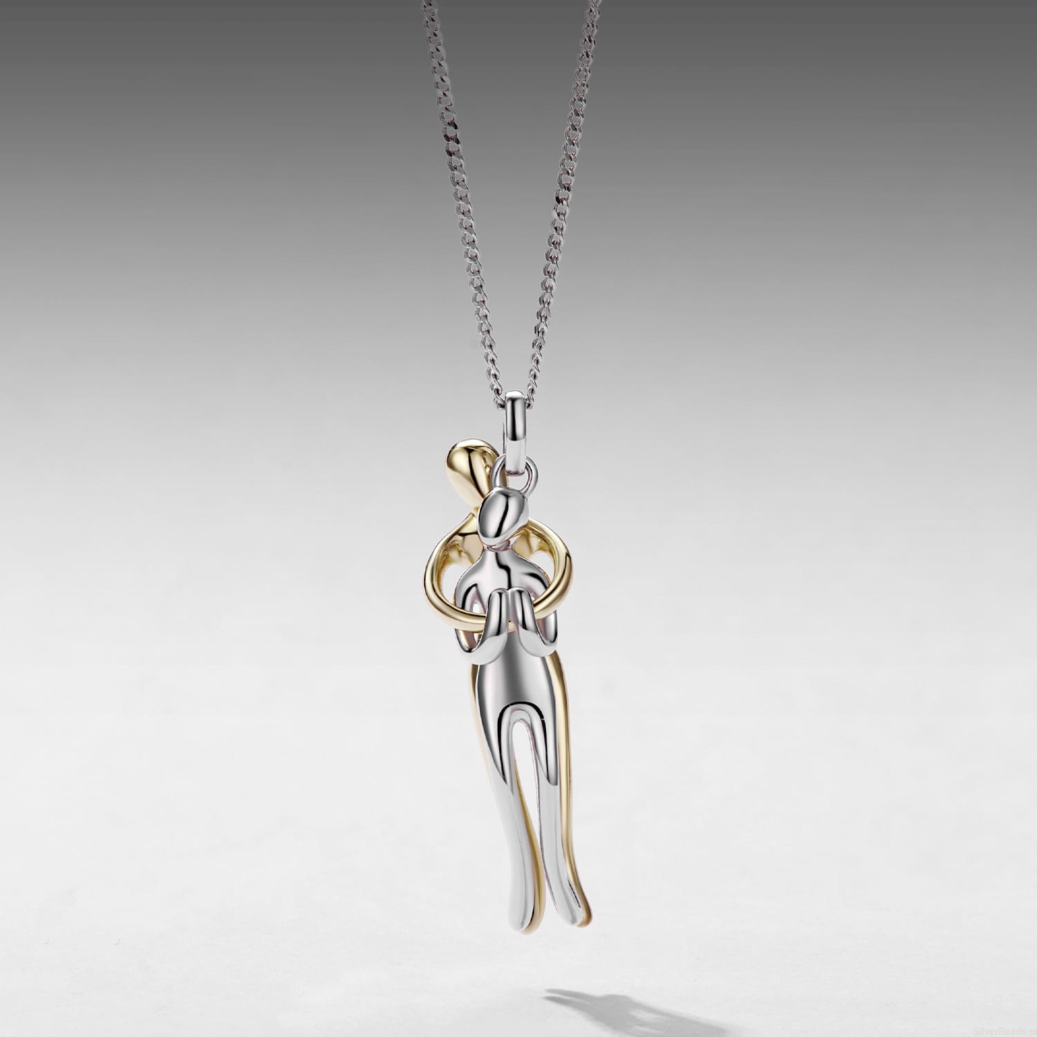 Wyjątkowy srebrny naszyjnik przedstawiający splecioną parę w czułym objęciu to subtelny symbol miłości, jedności i wzajemnego wsparcia. Kontrast dwóch kolorów – chłodnego srebra i ciepłego złotego akcentu – podkreśla harmonię dwóch osób, które mimo różnic tworzą nierozerwalną całość. Minimalistyczna, nowoczesna forma nadaje biżuterii elegancki i ponadczasowy charakter. To idealny prezent dla ukochanej osoby – na rocznicę, Walentynki lub jako wyraz głębokiego uczucia.