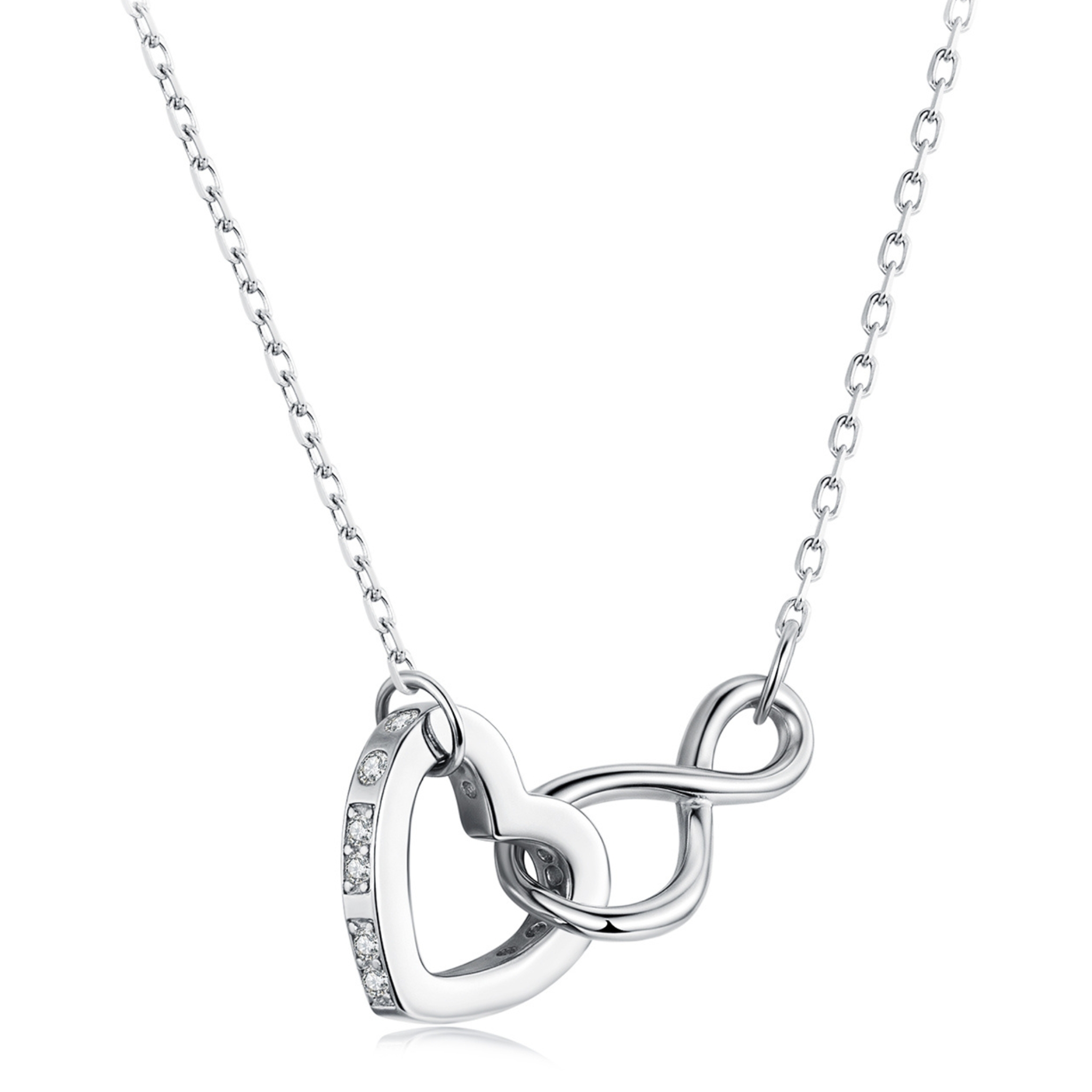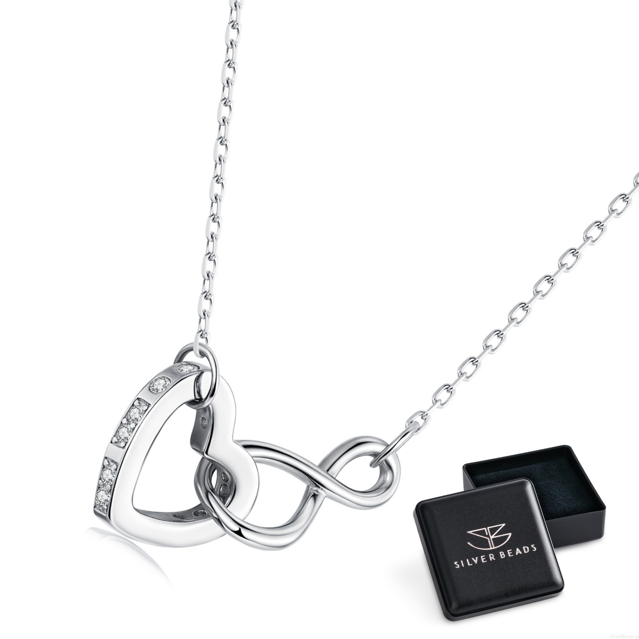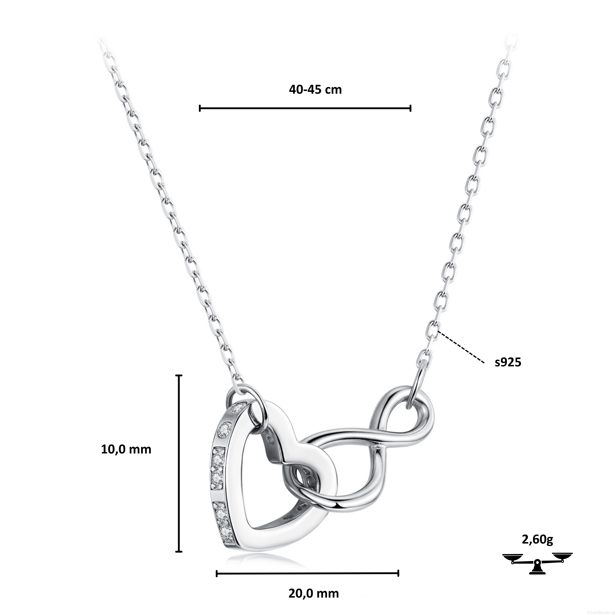 Srebrny naszyjnik: serduszko połączone ze znakiem nieskończoności.