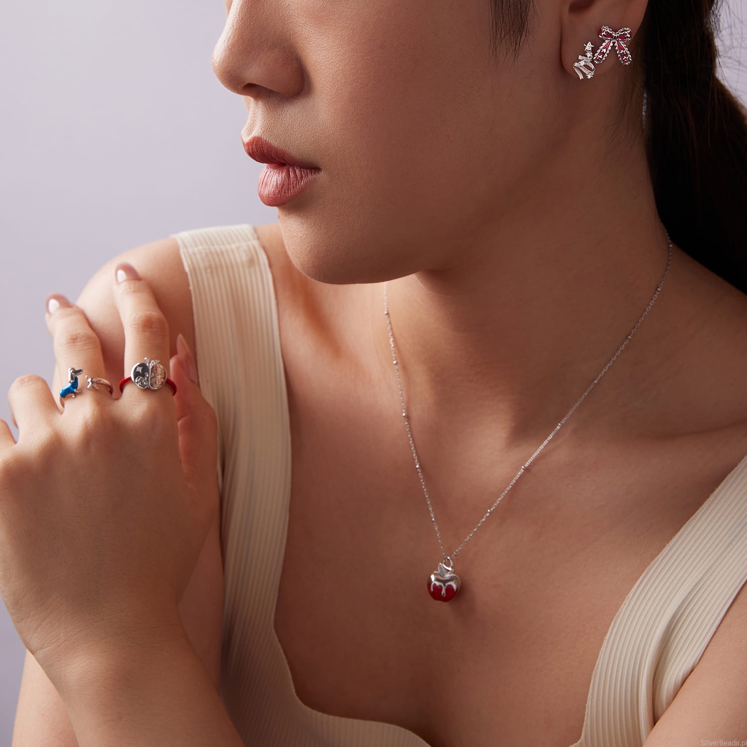 Ten srebrny pierścionek w kształcie świątecznego jabłka to radosna opowieść zamknięta w biżuterii. Na jego powierzchni znajdziesz urocze symbole zimy – pierniczka, bałwanka, choinkę i gwiazdkę – które przywołują ciepłe wspomnienia świąt. Czerwony pierścionek nawiązuje do tradycyjnych ozdób i dziecięcej radości z magii Bożego Narodzenia. Idealny jako drobny prezent pełen serca lub wyjątkowy akcent świątecznej stylizacji.
