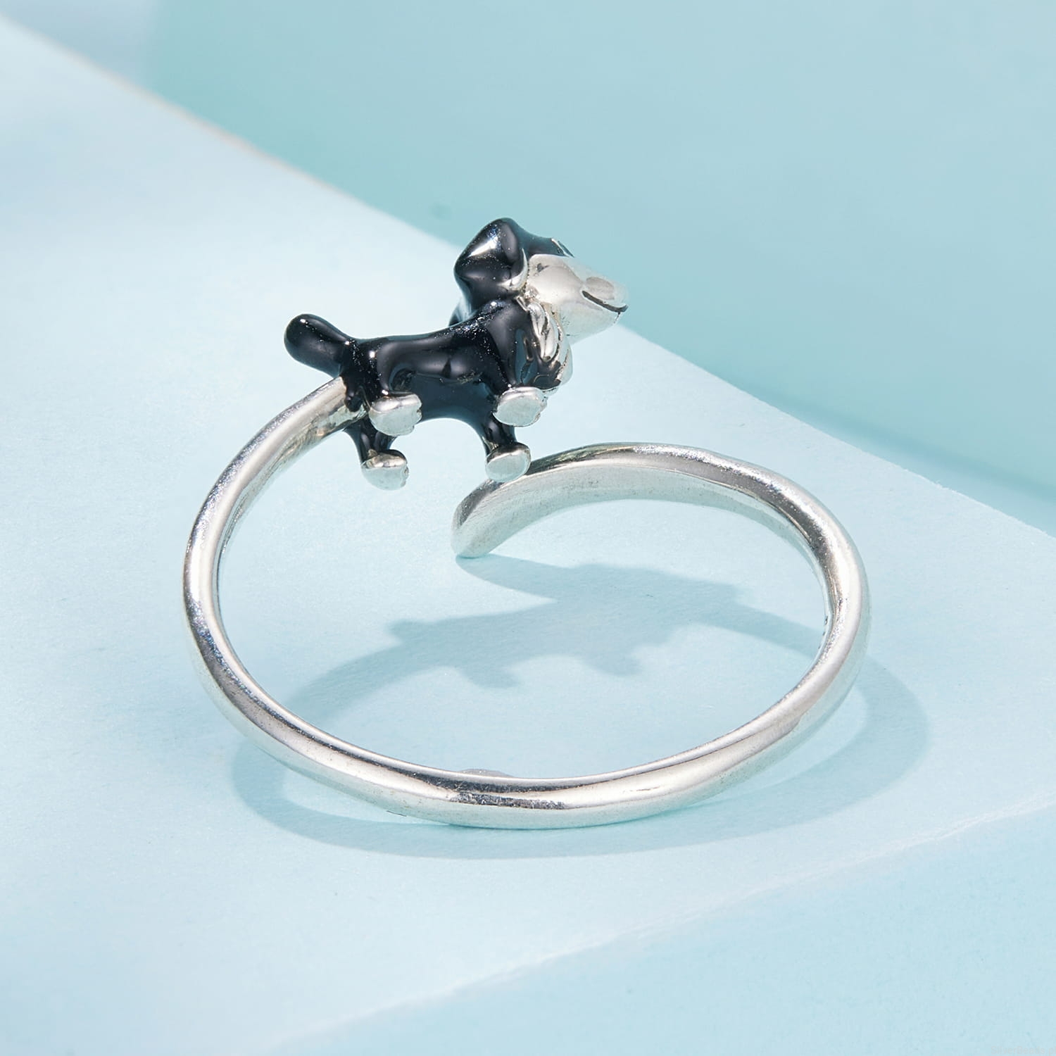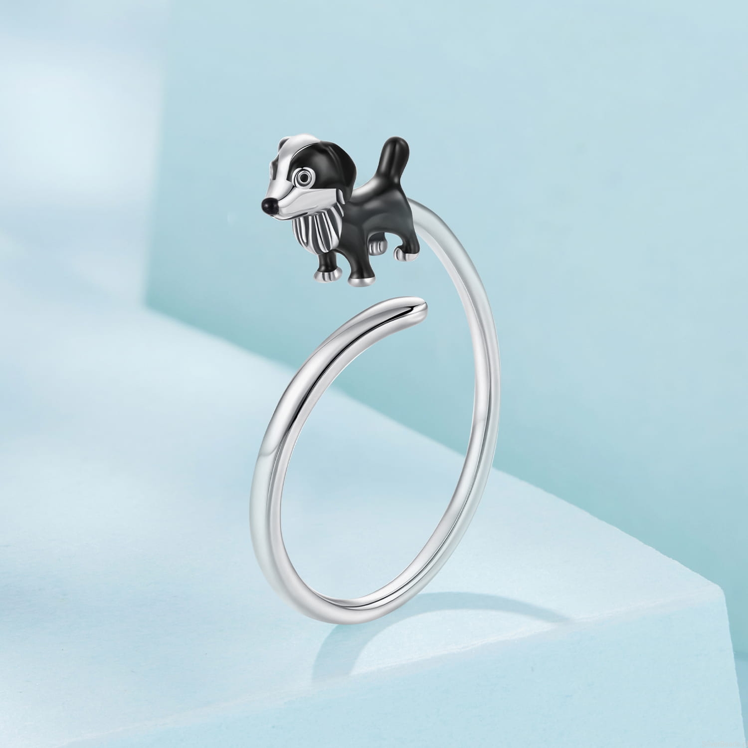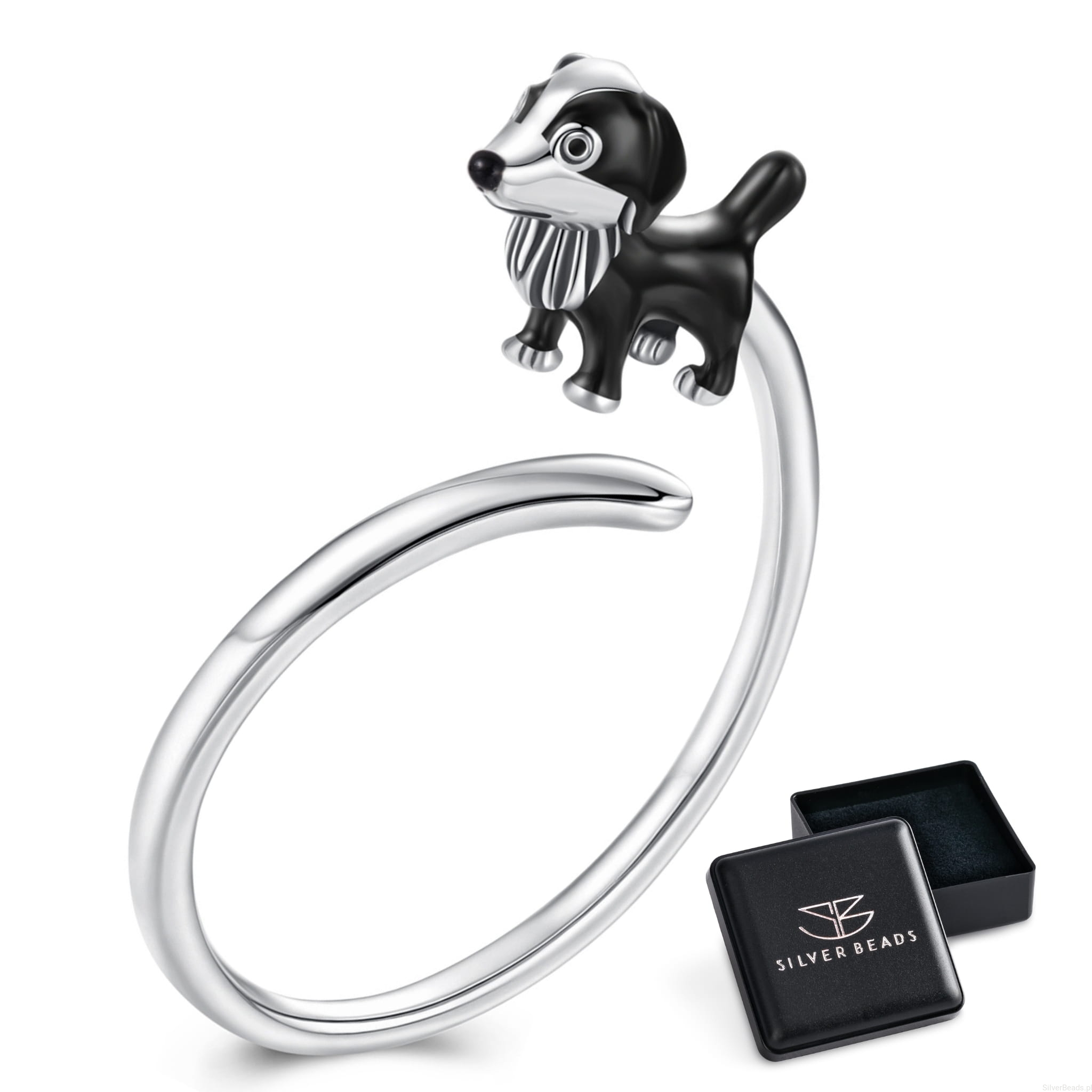 Pierścionek w kształcie psa rasy Border Collie to wyjątkowa propozycja dla miłośników czworonogów. Figurka psa została starannie wykonana ze srebra próby 925 i pokryta czarno-białą emalią, dzięki czemu prezentuje się realistycznie i uroczo. Regulowany rozmiar sprawia, że jest to biżuteria dopasowana do każdej dłoni – idealna na prezent lub jako osobisty symbol miłości do pupila.