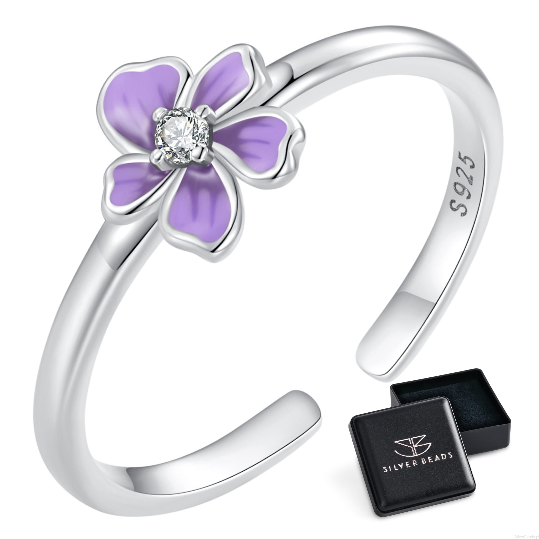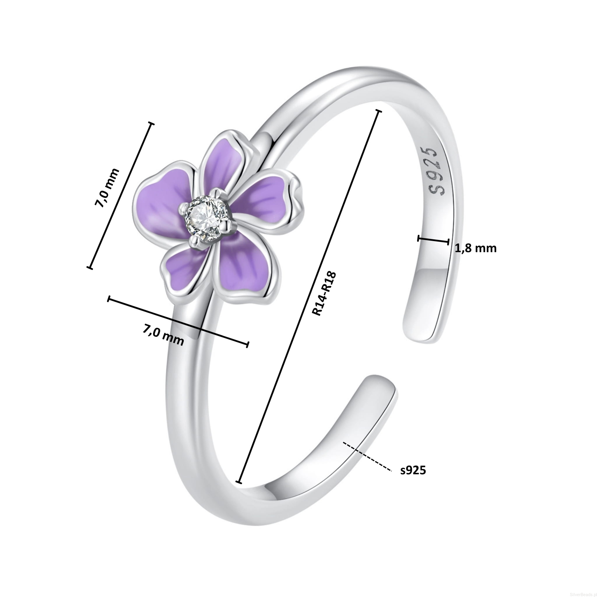 Ten srebrny pierścionek z fioletowym kwiatkiem to symbol delikatności, świeżości i kobiecego wdzięku. Kwiat reprezentuje piękno natury, rozwój i subtelne emocje, a jego fioletowy kolor dodaje spokoju i romantyzmu. To idealny wybór dla kobiet, które kochają lekką, kwiatową biżuterię z nutą koloru – pełen uroku akcent na co dzień i na wyjątkowe chwile.