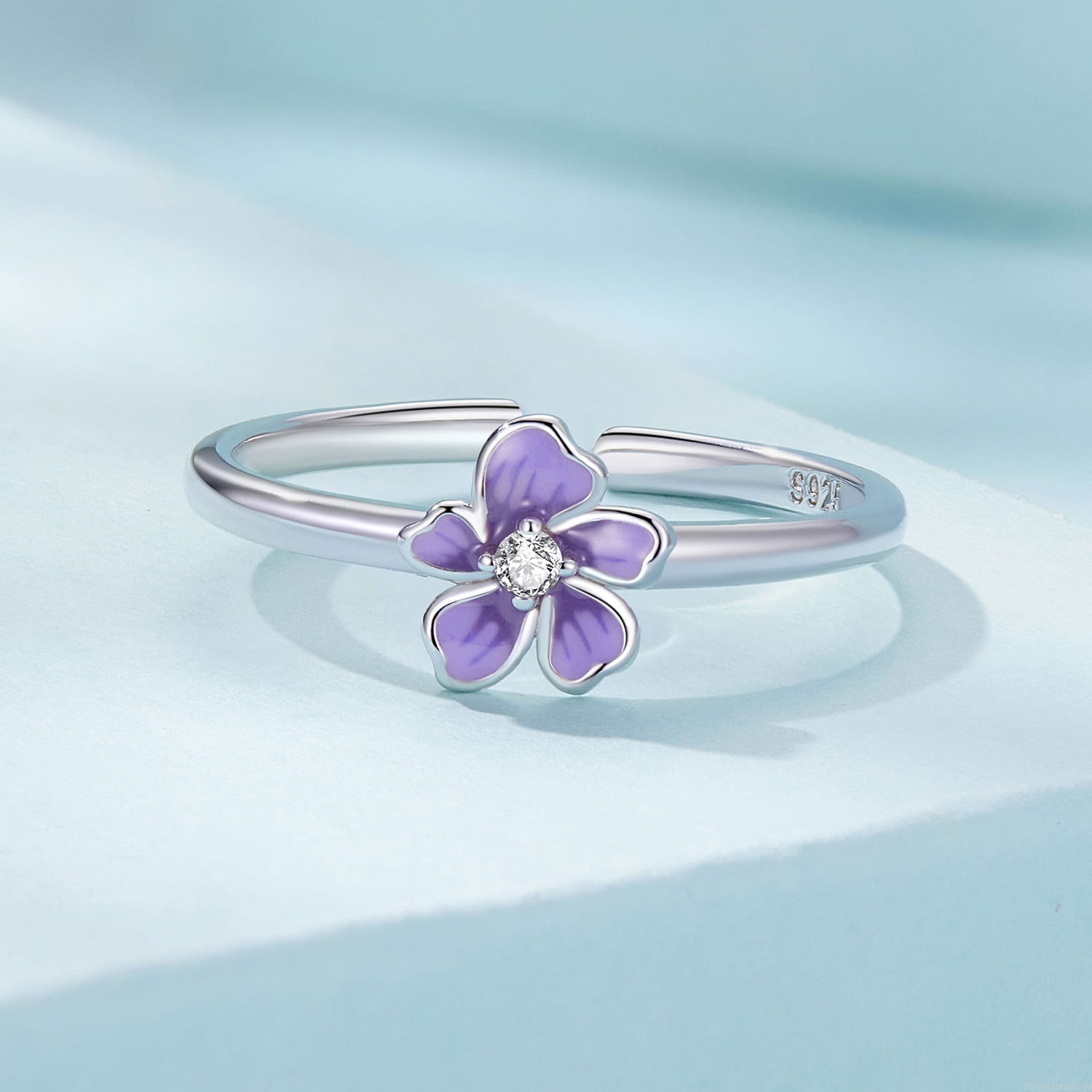 Srebrny pierścionek uniwersalny z fioletowym kwiatkiem srebro 925