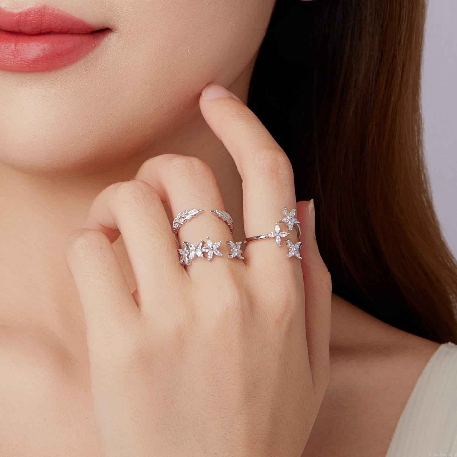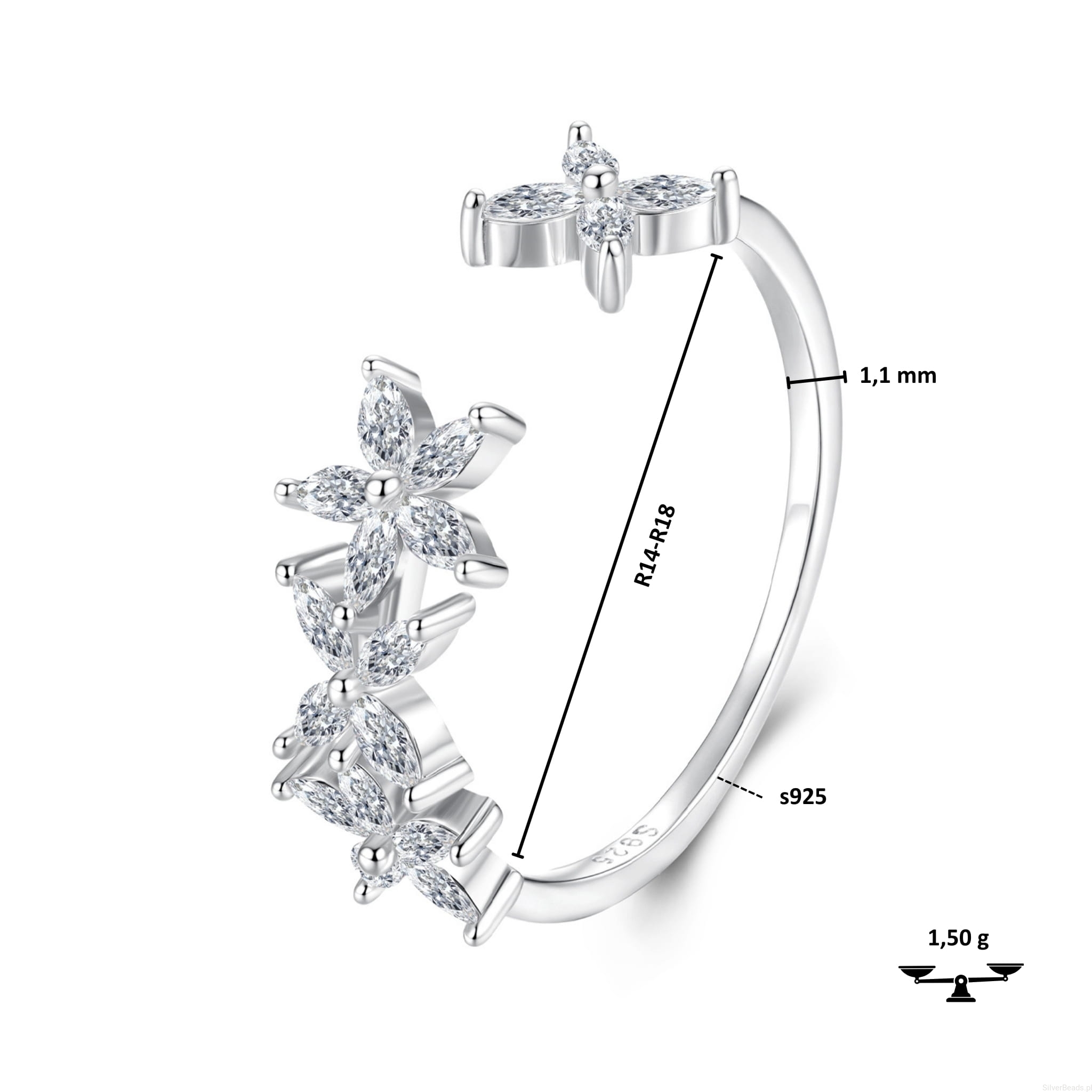 Elegancki, kobiecy pierścionek wykonany ze srebra próby 925, ozdobiony szeregiem lśniących kryształowych kwiatuszków o szlifie markizy. Ich precyzyjne osadzenie sprawia, że każdy płatek błyszczy jak mikroskopijny diament, tworząc efekt subtelnej, świetlistej girlandy kwiatowej. Otwarta forma pierścionka nadaje mu lekkości i nowoczesnego charakteru, a motyw kwiatów symbolizuje świeżość, radość i delikatne piękno natury. Idealny dla osób kochających biżuterię z wyraźnym, romantycznym akcentem.