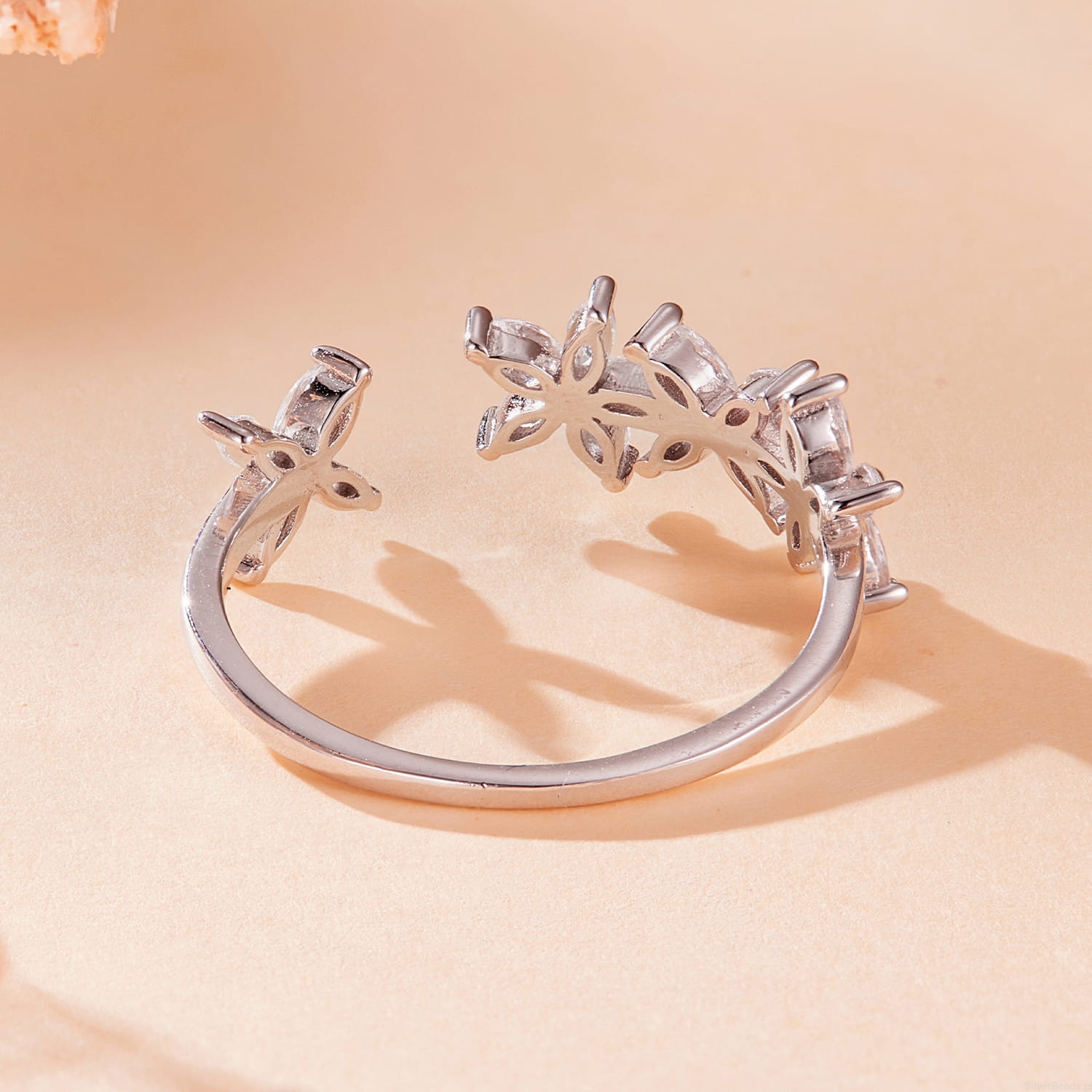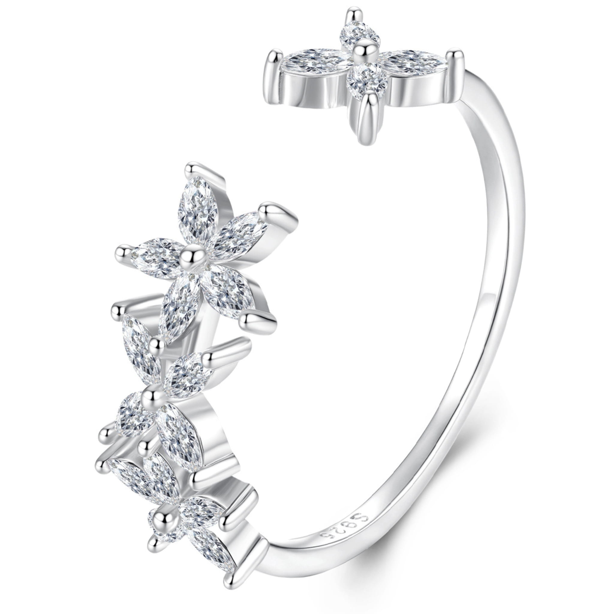 Srebrny regulowany pierścionek ze lśniącymi kwiatami.