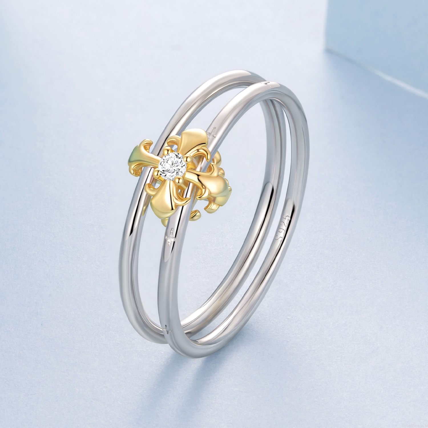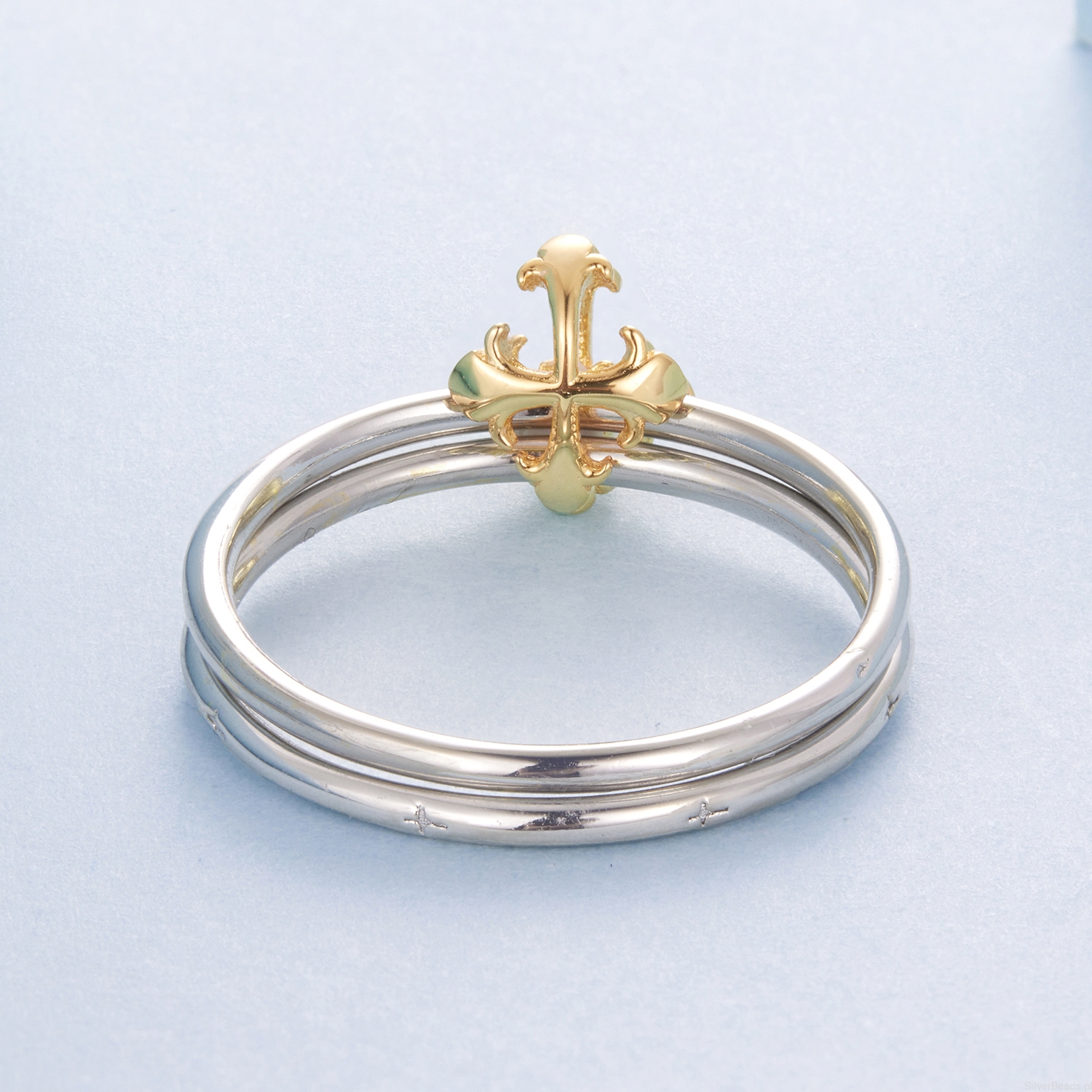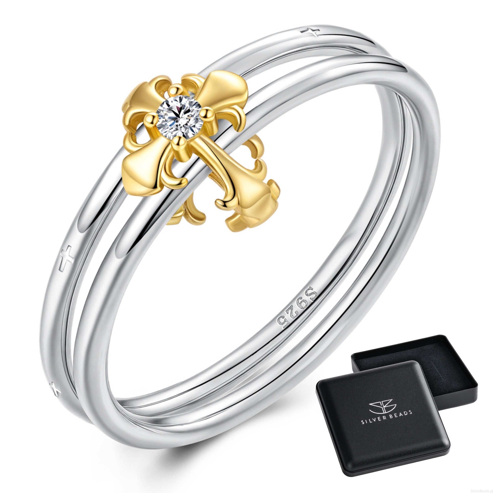Srebrny pierścionek z pozłacanym krzyżykiem.