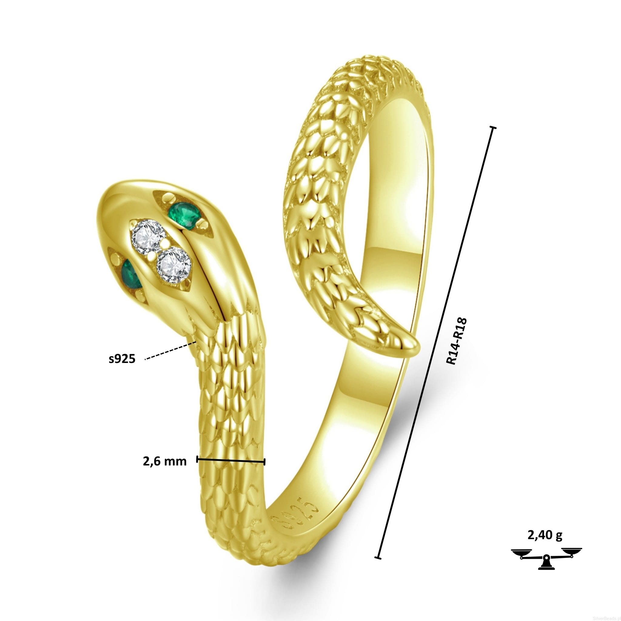 Srebrny pozłacany pierścionek regulowany ZIELONOOKI WĄŻ srebro 925