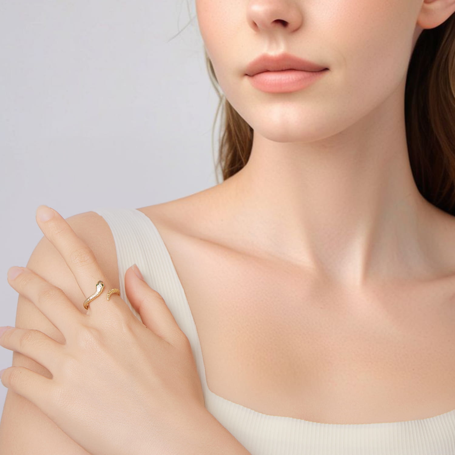 Pierścionek w kształcie złotej węża symbolizuje siłę transformacji, odwagę i wewnętrzną moc, a jego precyzyjnie zdobione łuski podkreślają elegancję i pewność siebie. Zielone oczy nadają mu hipnotyzującego charakteru, przywołując skojarzenia z tajemnicą i intuicją, która prowadzi przez życiowe wyzwania. To subtelne połączenie finezji i drapieżnej energii, idealne dla osób, które nie boją się wyróżniać. Biżuteria ta podkreśla indywidualizm, magnetyzm i naturalny urok noszącej ją osoby.
