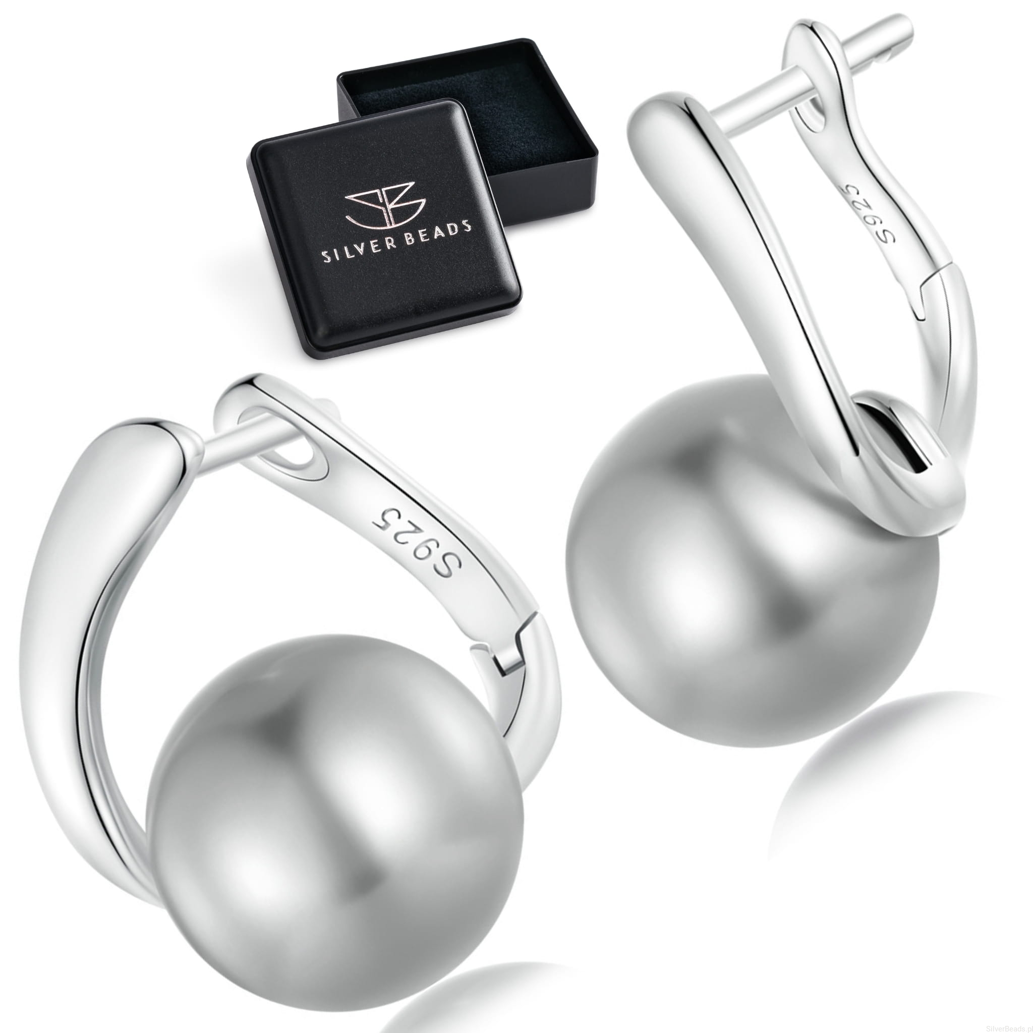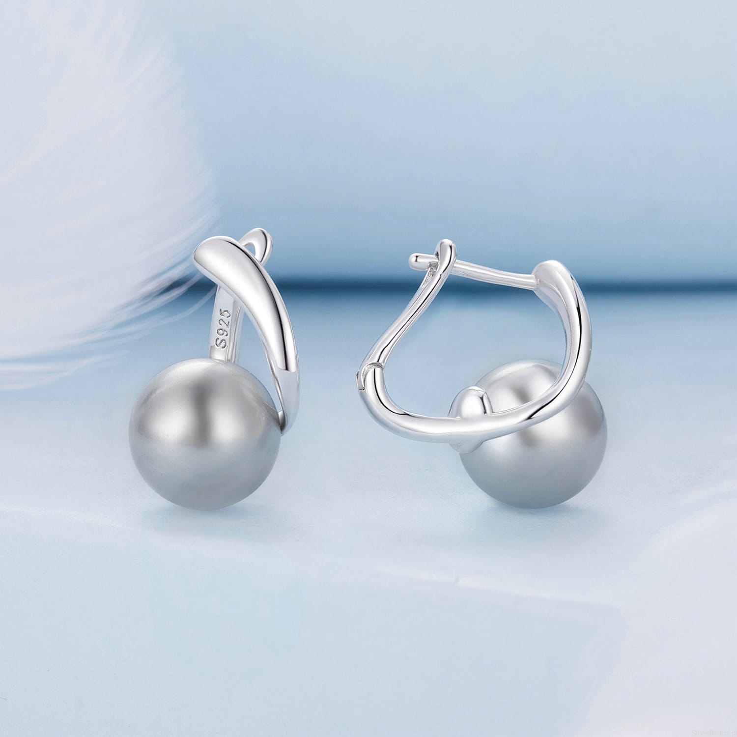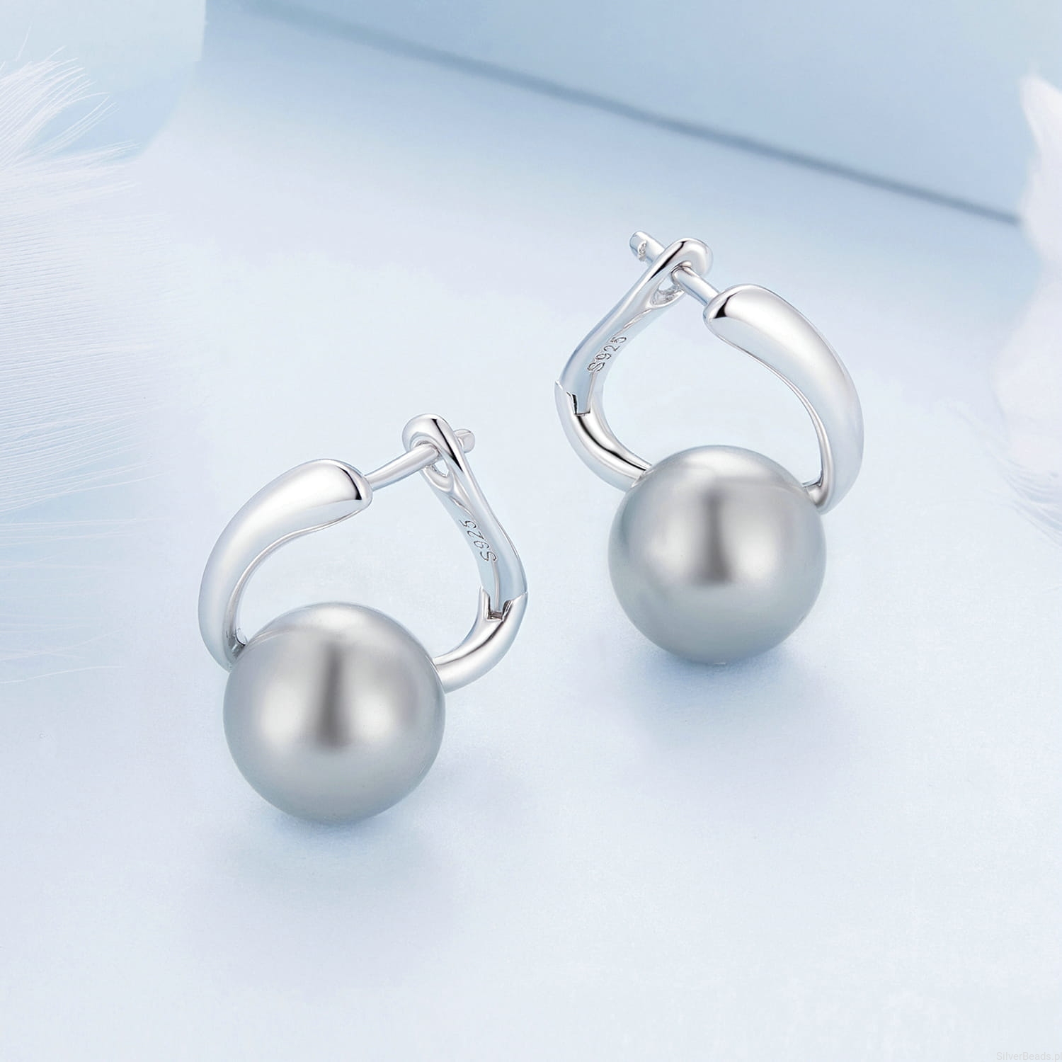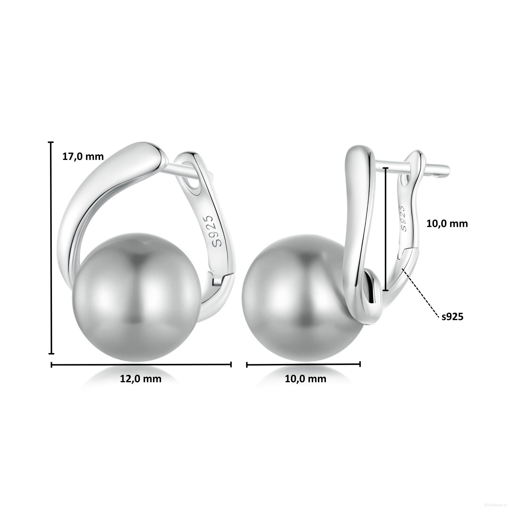 Srebrne kolczyki, bigle zamykane szare perły.